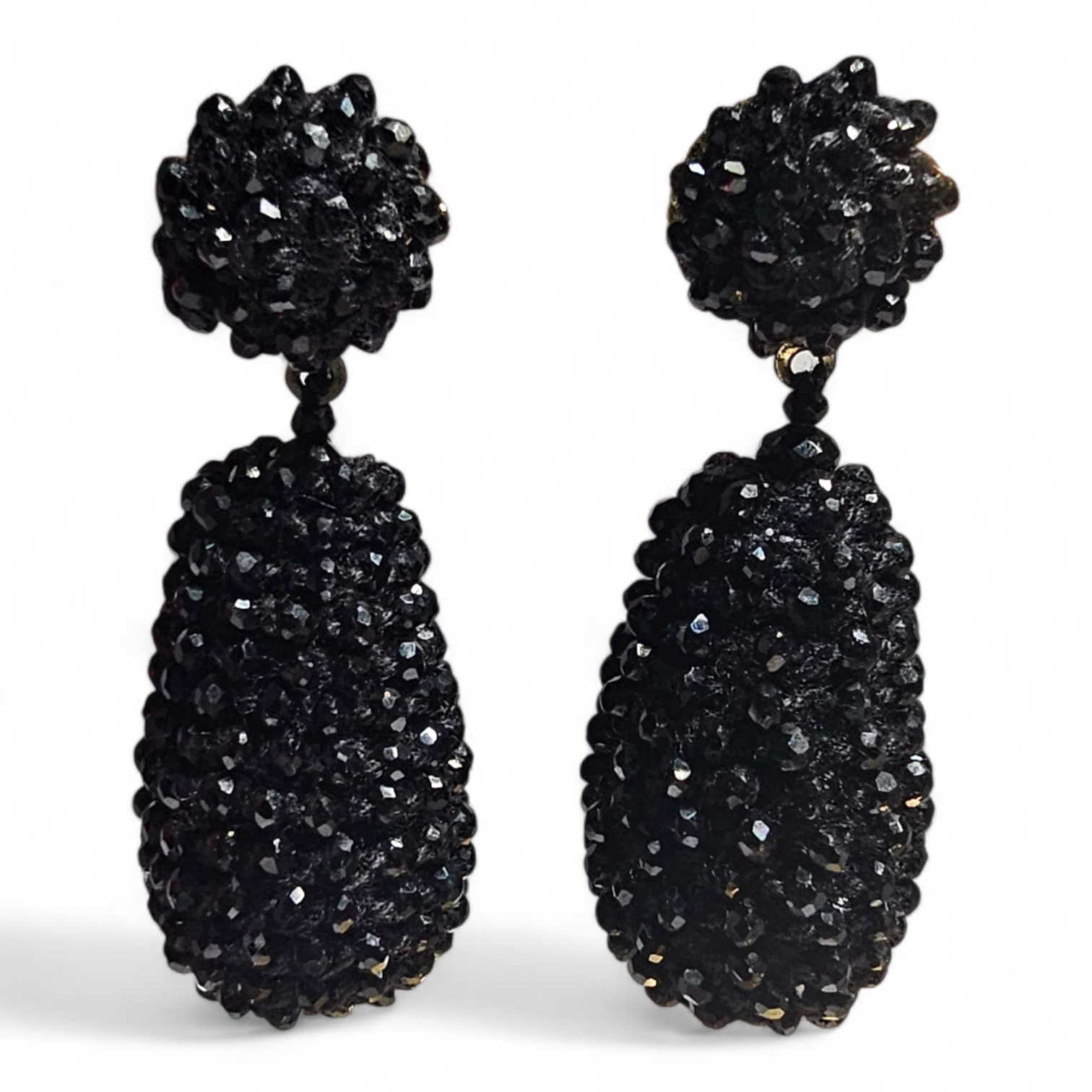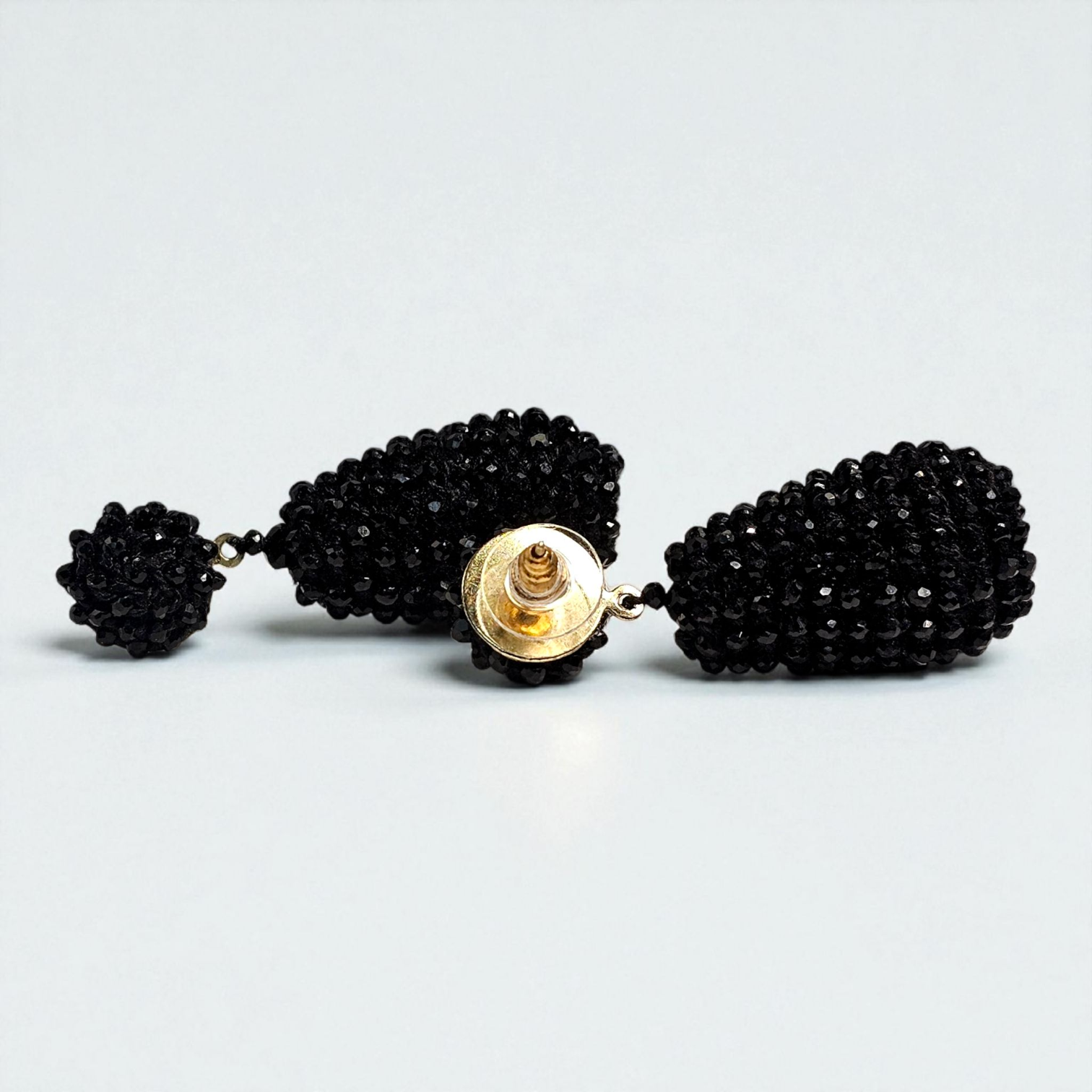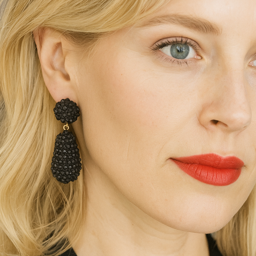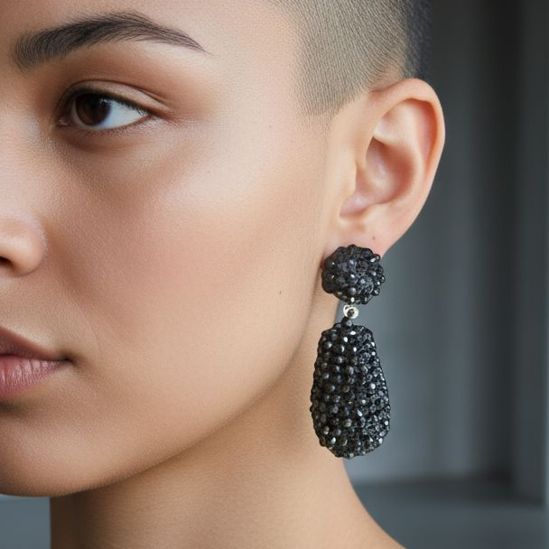 The Beaded Drop earrings celebrate the intricate craftsmanship of the LONA LOOM Beaded Collection. Each pair is crocheted by hand with delicate glass beads, woven tightly around a smooth wooden core. The result is a soft yet structured texture that catches the light beautifully. Available in a range of expressive tones from deep black and bronze to vibrant red and green every color tells its own story. Despite their sculptural appearance, they weigh just 6.2 grams, offering a statement look that feels featherlight.