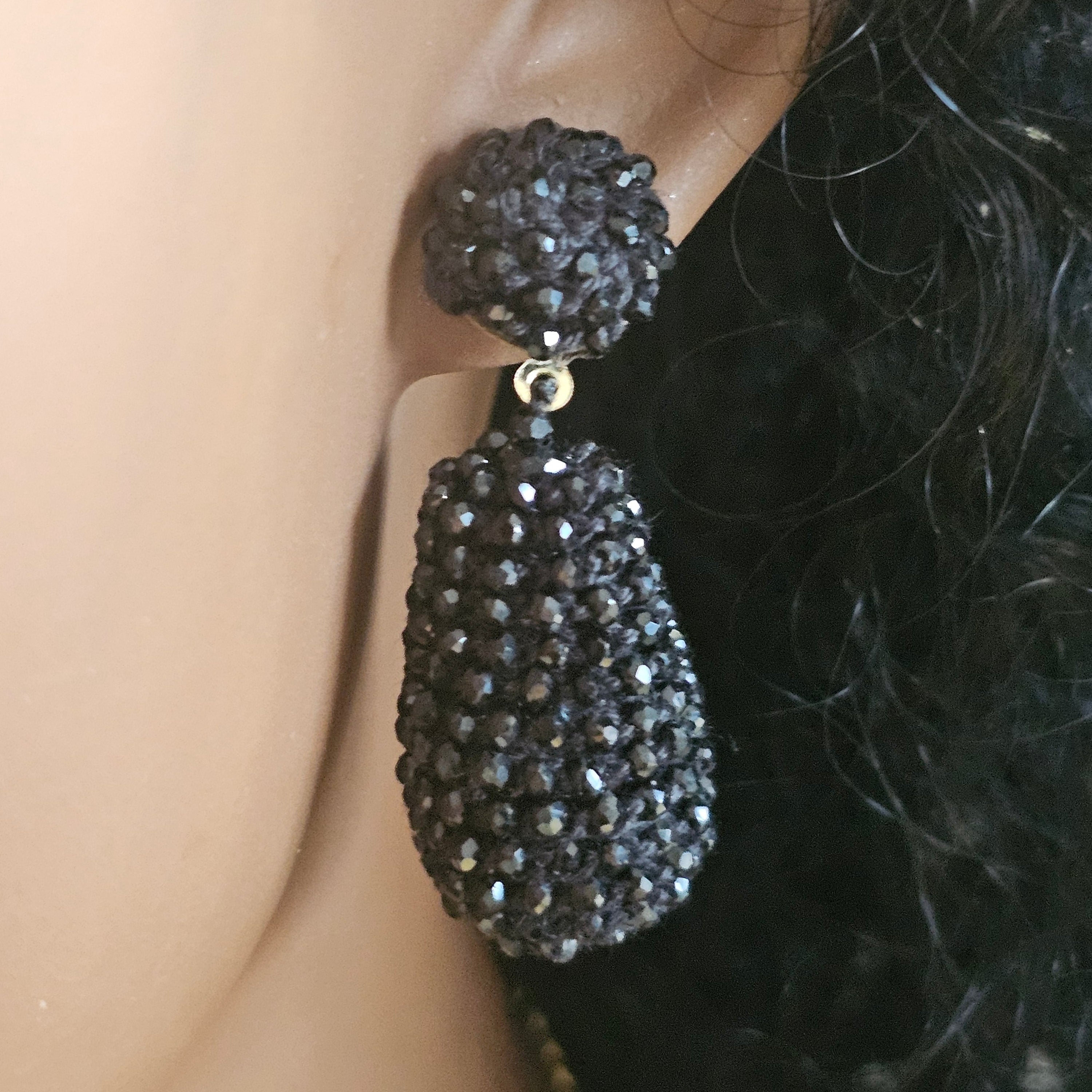 Handcrafted drop earrings crocheted with fine glass beads around a wooden base. Measuring 5 cm and weighing only 6.2 grams, they’re lightweight rich texture, timeless shape.