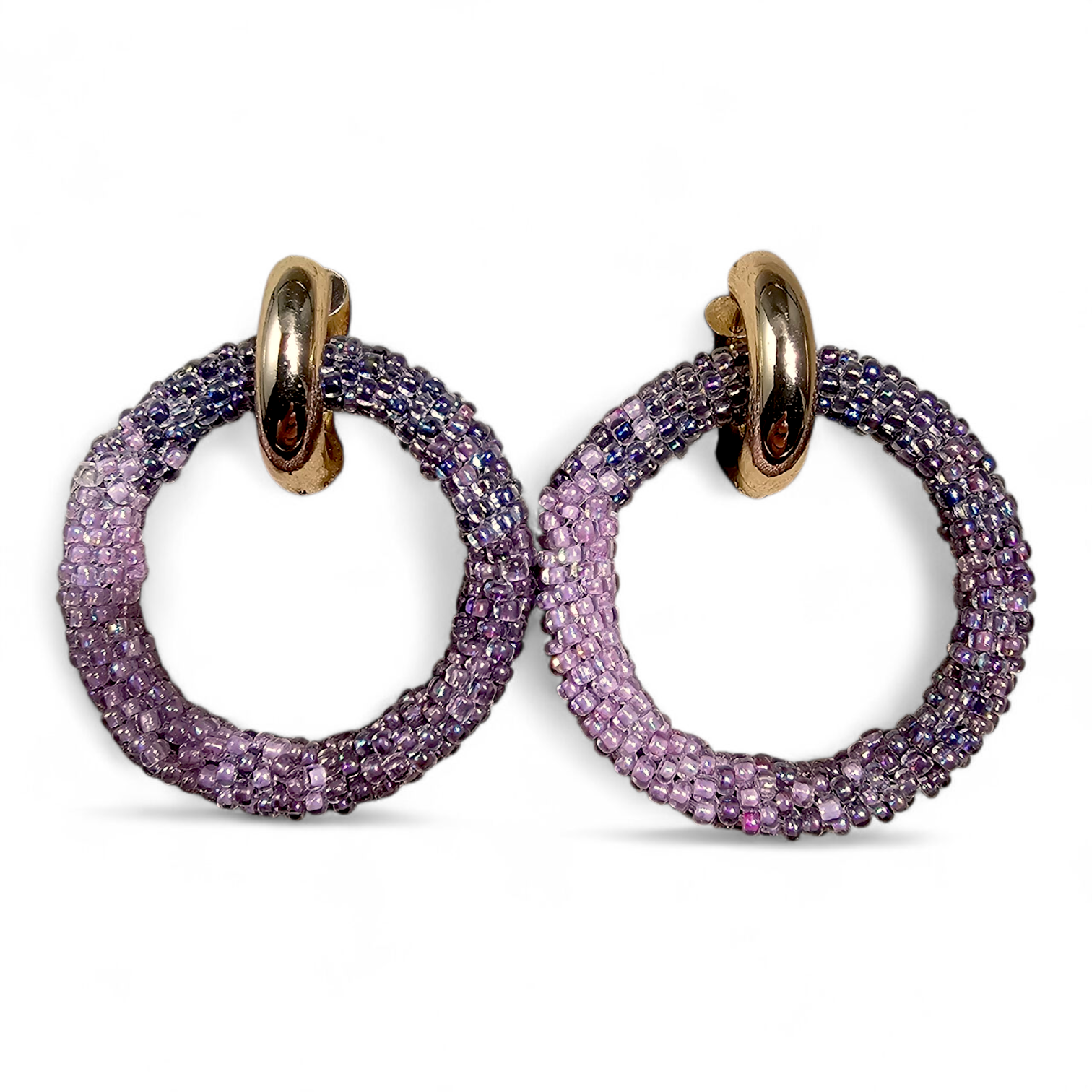 Handcrafted ring-shaped earrings crocheted with fine violet glass beads around a golden metal base. Measuring 4.5 cm and weighing 11.2 grams, they combine bold texture with refined craftsmanship.