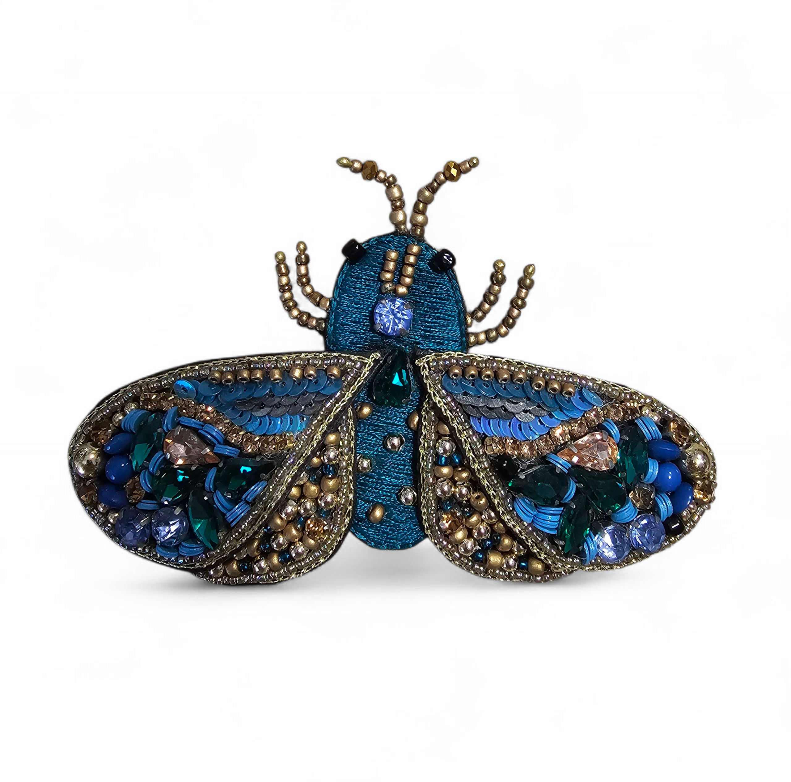 Wingstill doesn’t flutter she lands. Bold and weighty, this oversized butterfly brooch is embroidered in lush greens and inky blues, with thick stitching and strong contrast. She doesn’t whisper transformation she shows it. Chunky, grounded, and unmistakably present.