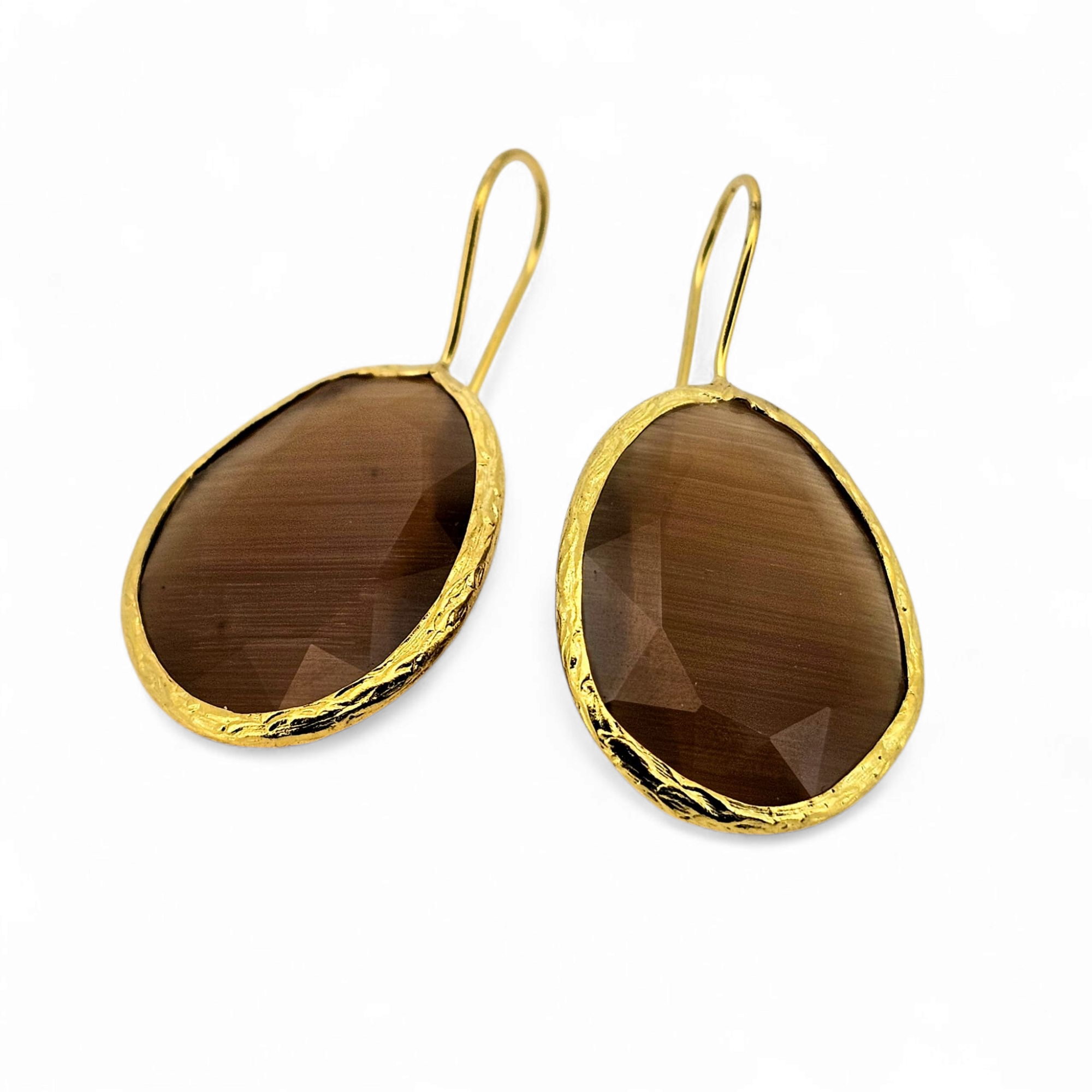 Handcrafted drop earrings with a brown cat eye stone in large size, set in 24k gold-plated brass. Bold, timeless, and elegant.