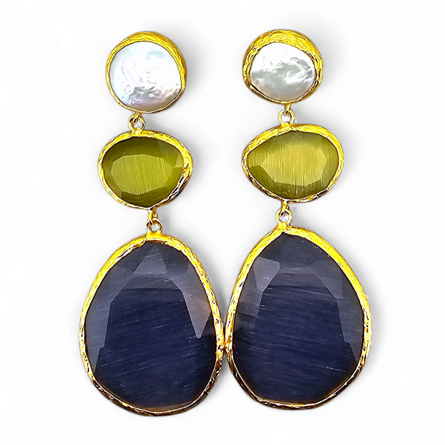 A gentle trio of pearl, olive, and purple cateye stones softly radiant, earthy, and intuitively bold.
