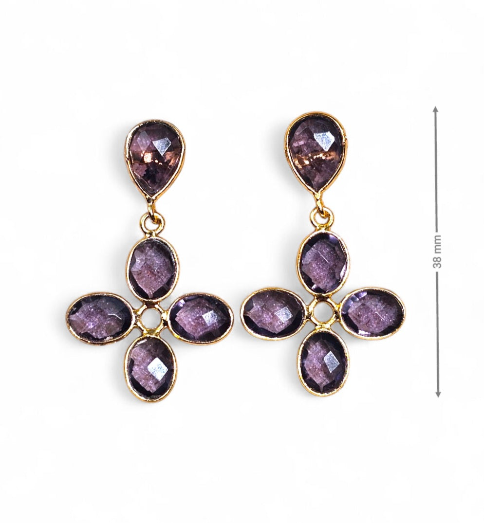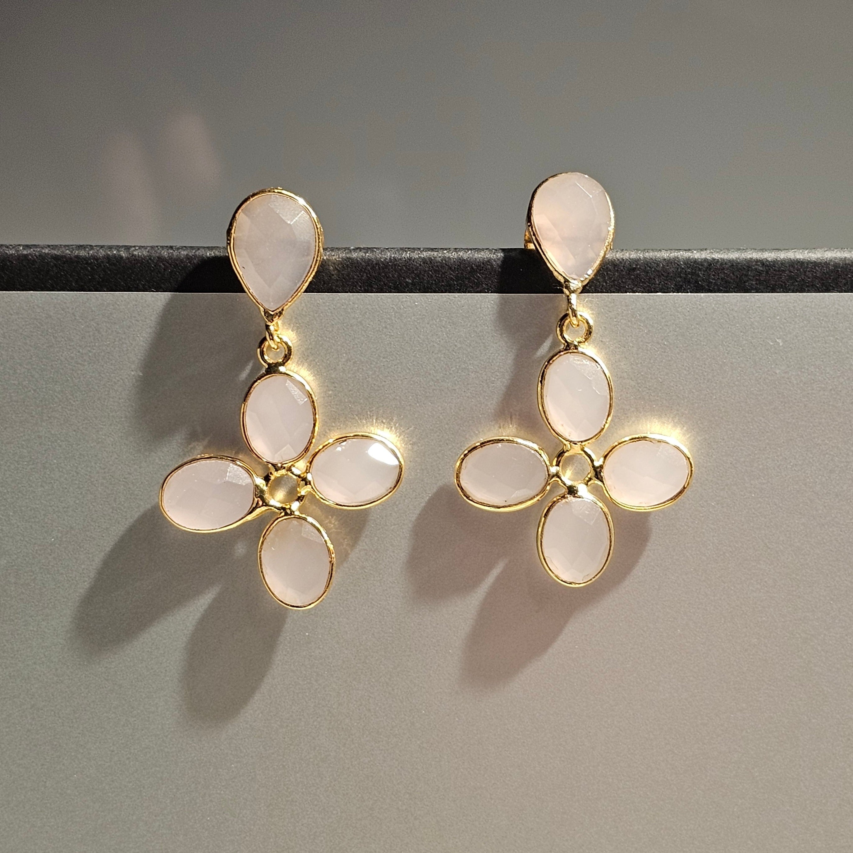 Delicate handcrafted earrings with four small rose quartz stones and a top stud detail. Measuring 3.8 cm and weighing only 2.7 grams, they’re featherlight soft pink glow, refined shape.