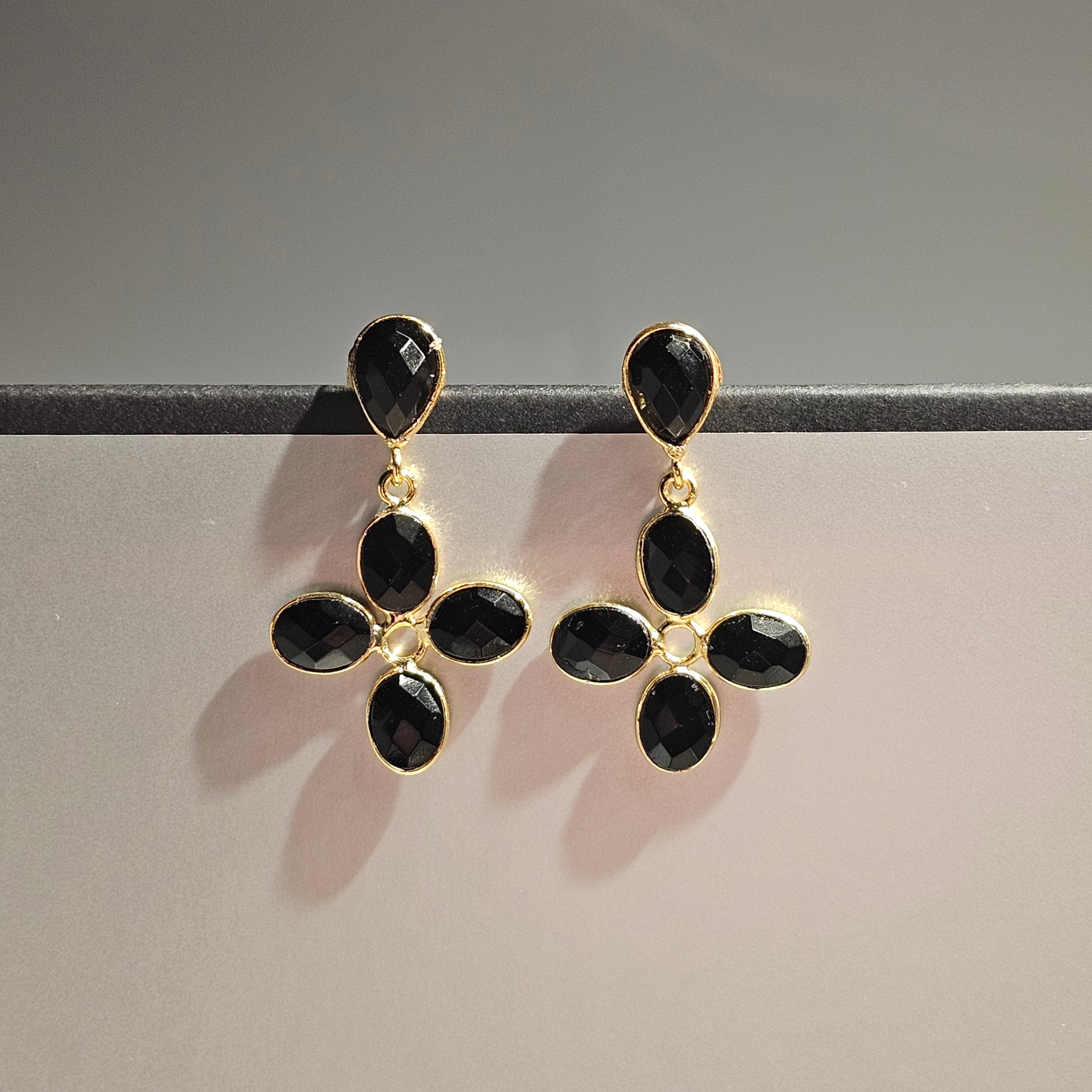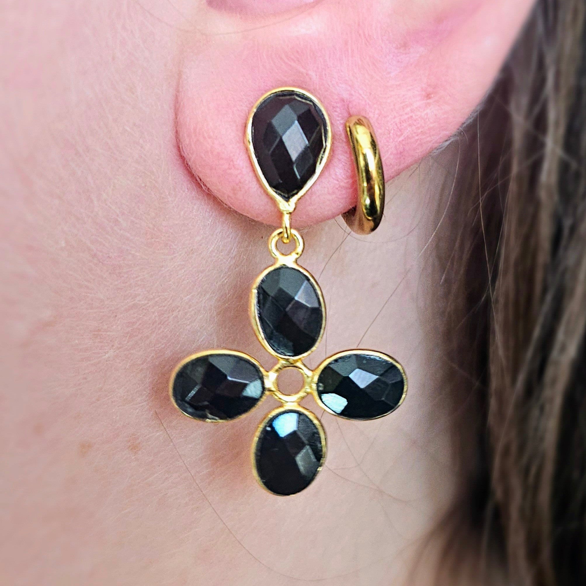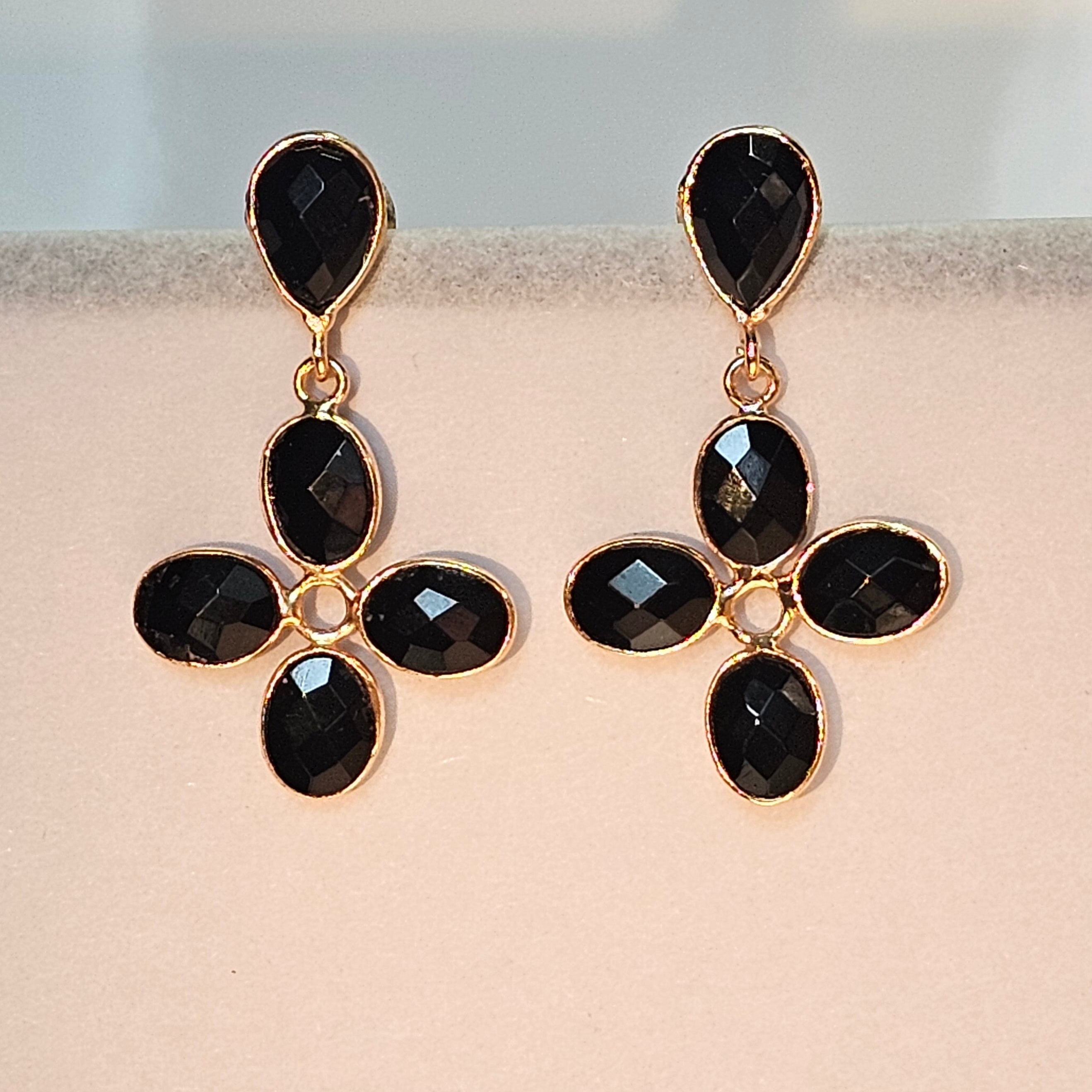 Delicate handcrafted earrings with four small black onyx stones and a top stud detail. Measuring 3.8 cm and weighing only 2.7 grams, they’re featherlight bold color, refined shape.