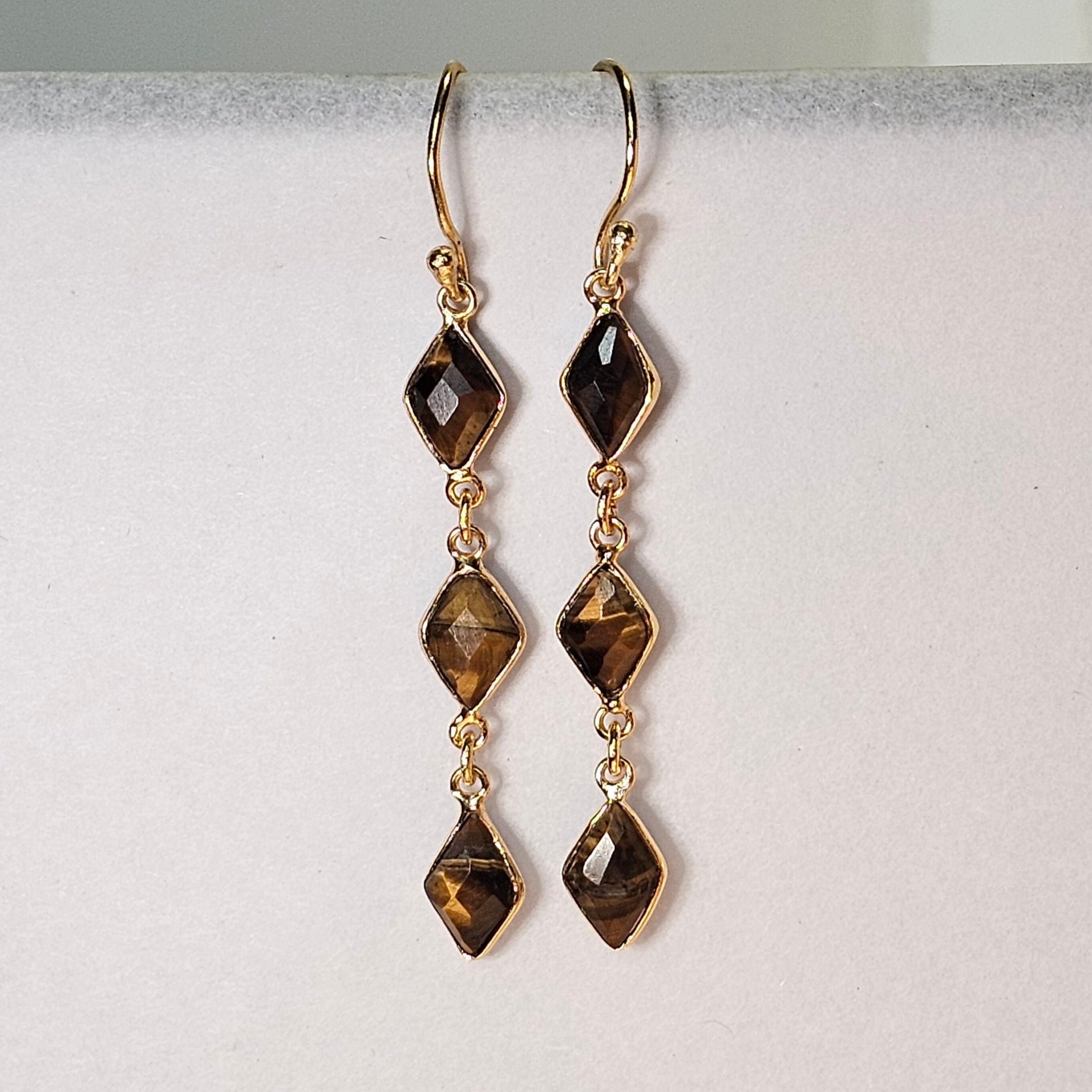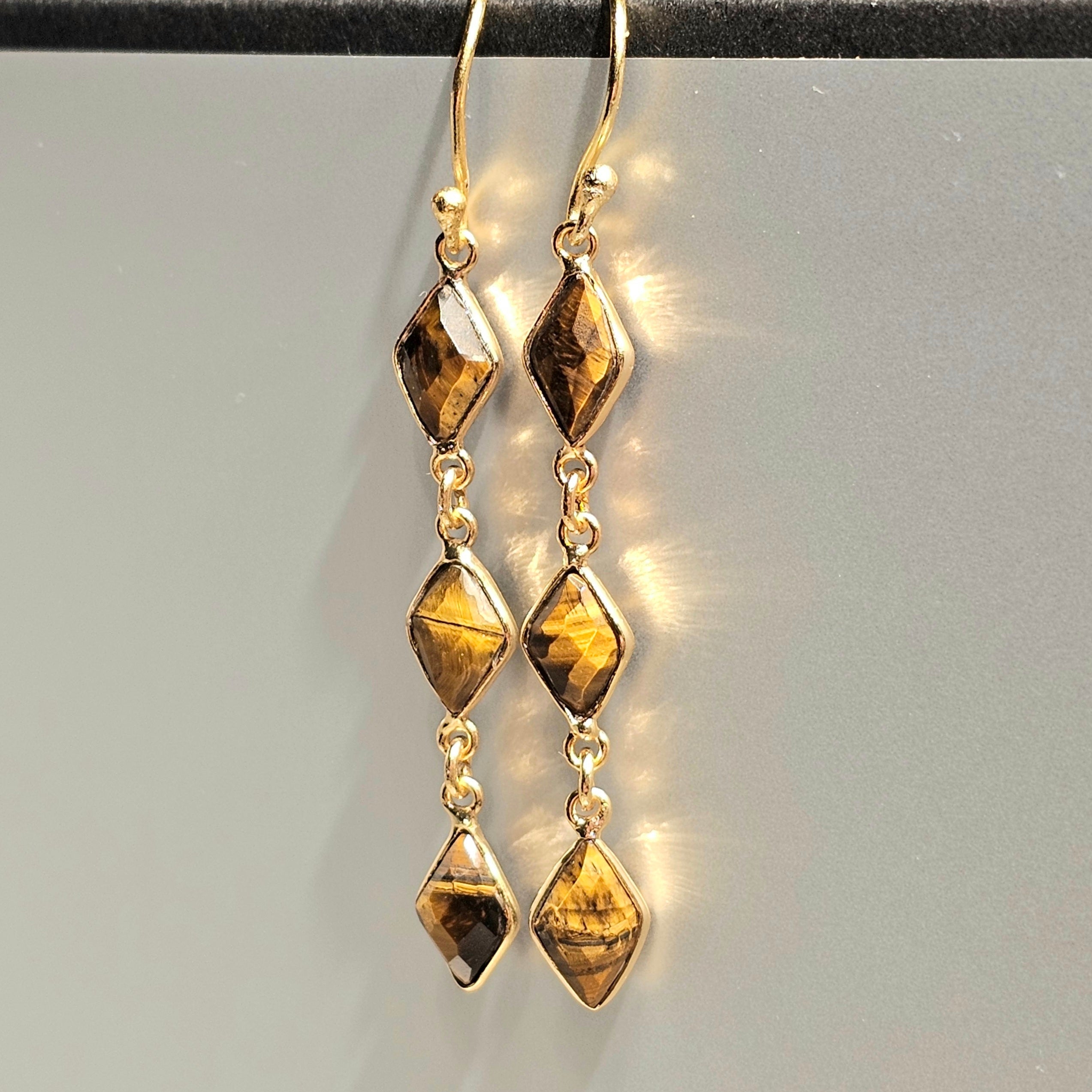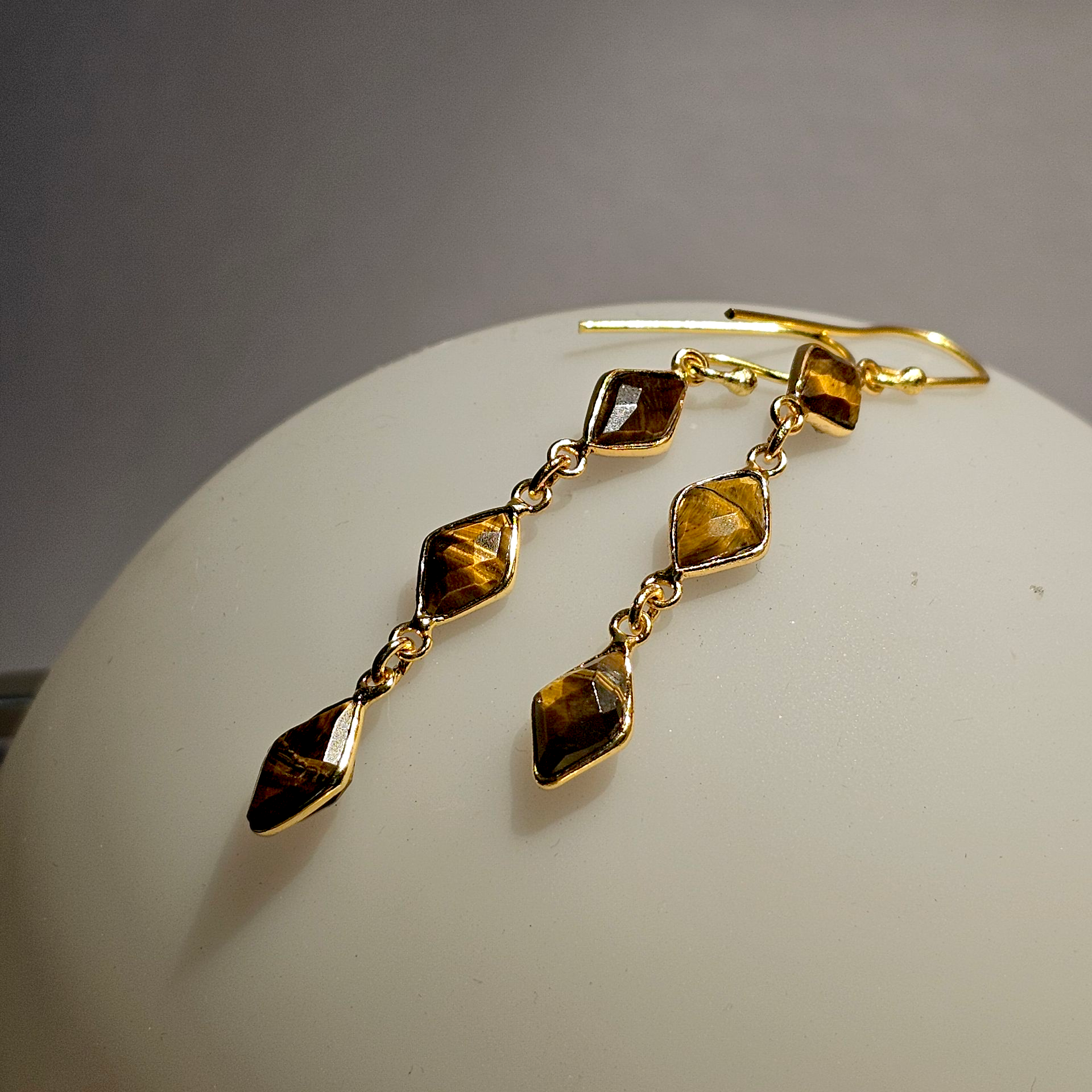 Delicate handcrafted earrings with three natural tiger eye stones in a vertical design. Measuring 6.5 cm and weighing only 2 grams, they’re featherlight warm glow, refined movement.