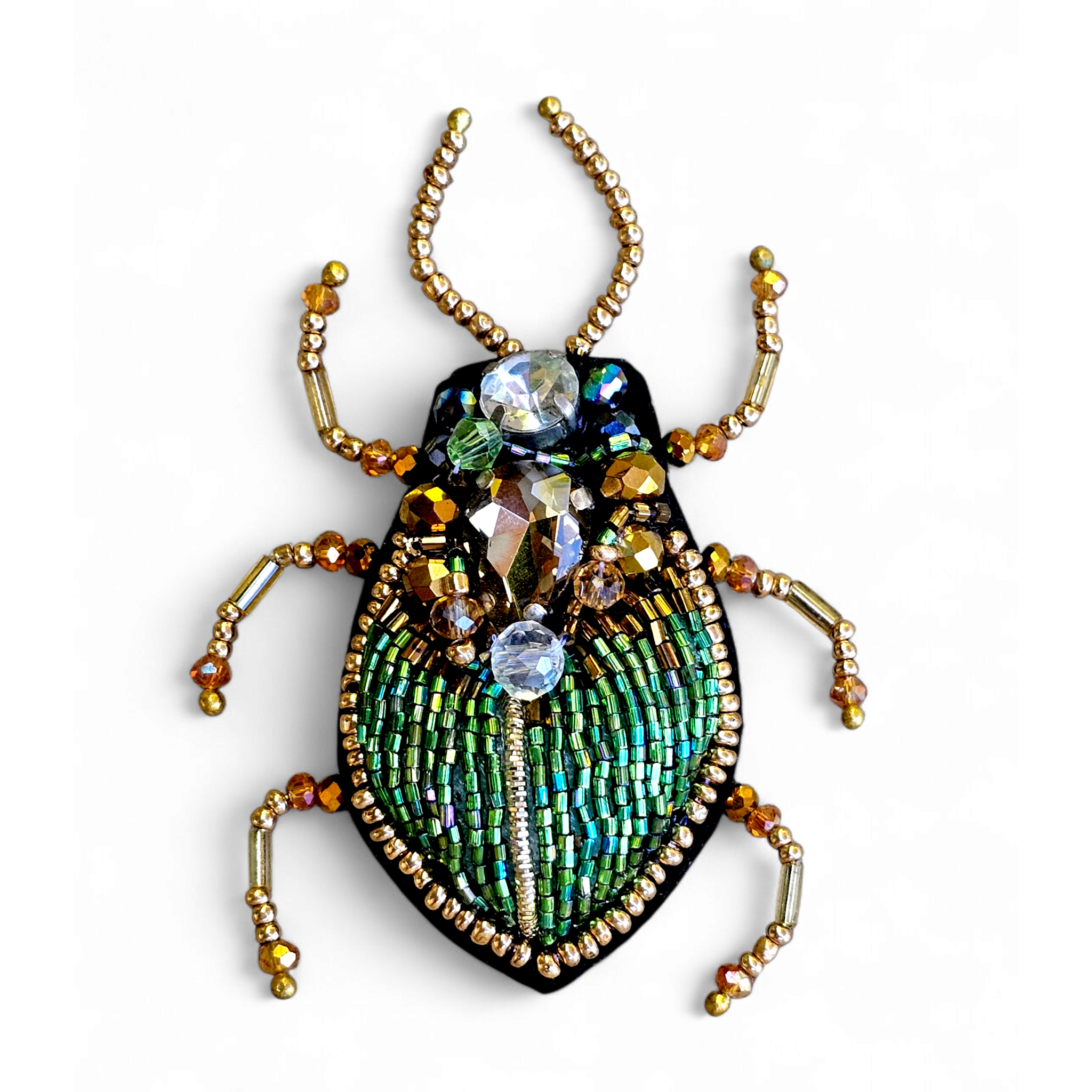 A green beetle brooch embroidered stillness, shielded and steady.