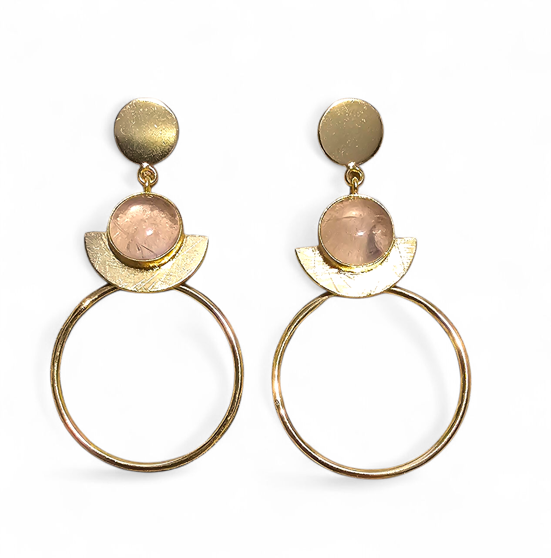 Handcrafted earrings with a golden arc, fine ring, and soft pink rose quartz. Lightweight and elegant, with a subtle cosmic touch.