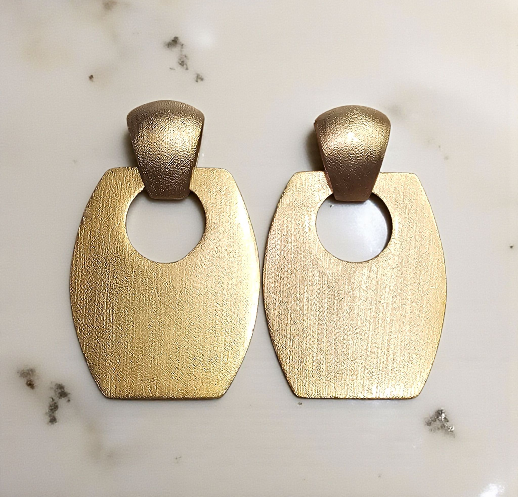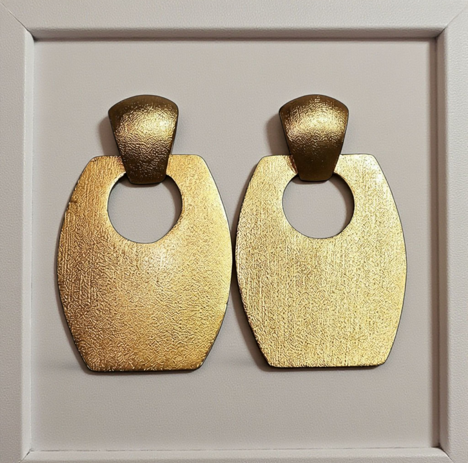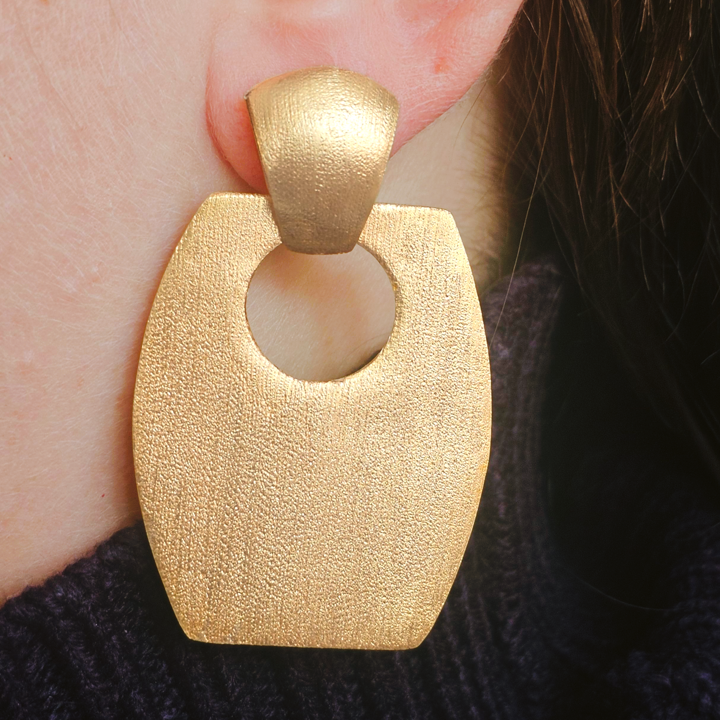 Sculptural statement earrings with a bold circular cut-out shape. Crafted from silver-plated brass with a golden lacquer finish. At 5.5 cm and only 7.1 grams, they’re striking yet ultra-light strength with ease.