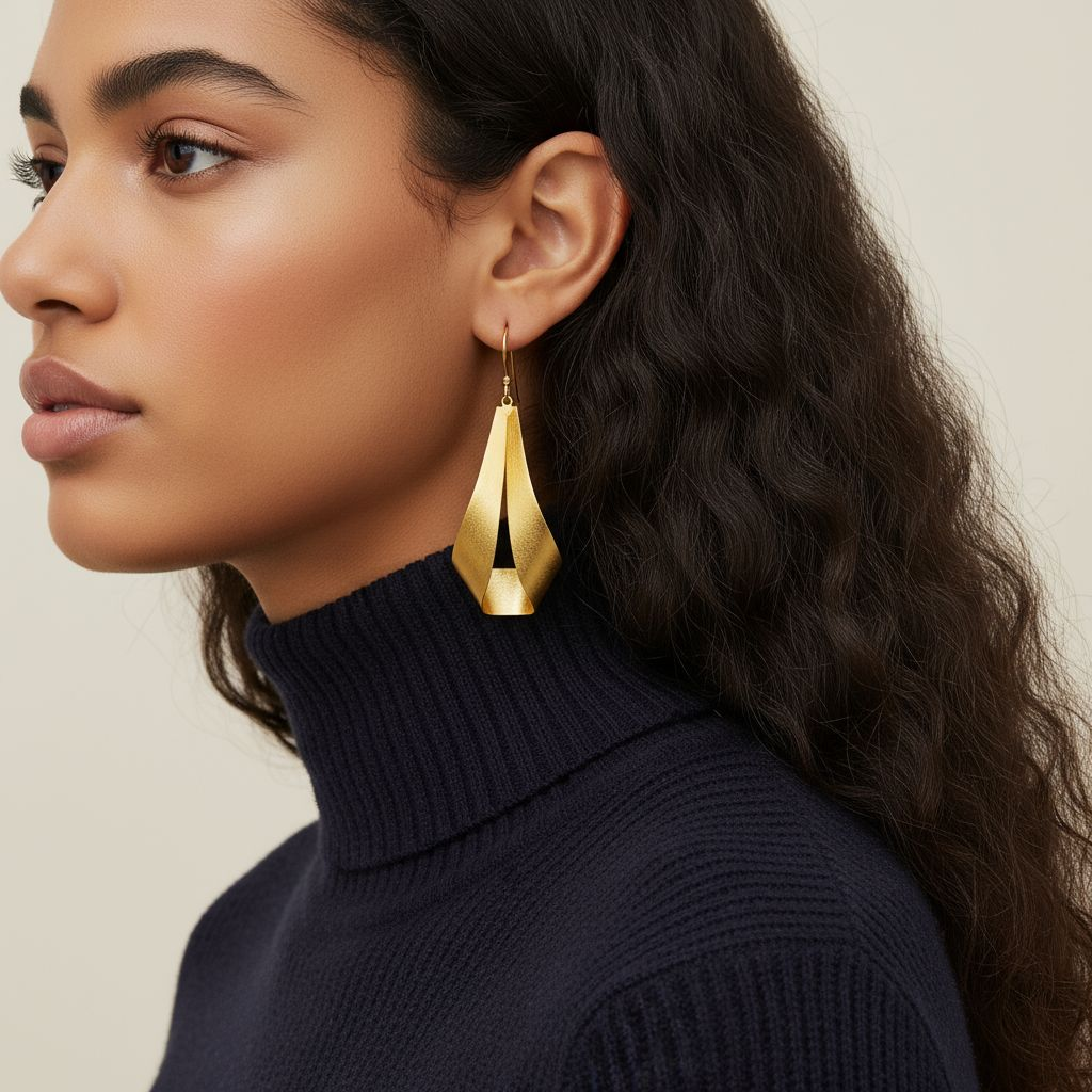 Sculptural ribbon-shaped earrings crafted from silver-plated brass with a golden lacquer finish. Measuring 8 cm in length and weighing just 7.1 grams, they’re impressively light movement and strength in perfect balance.