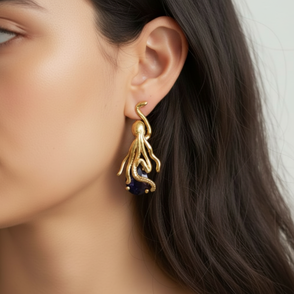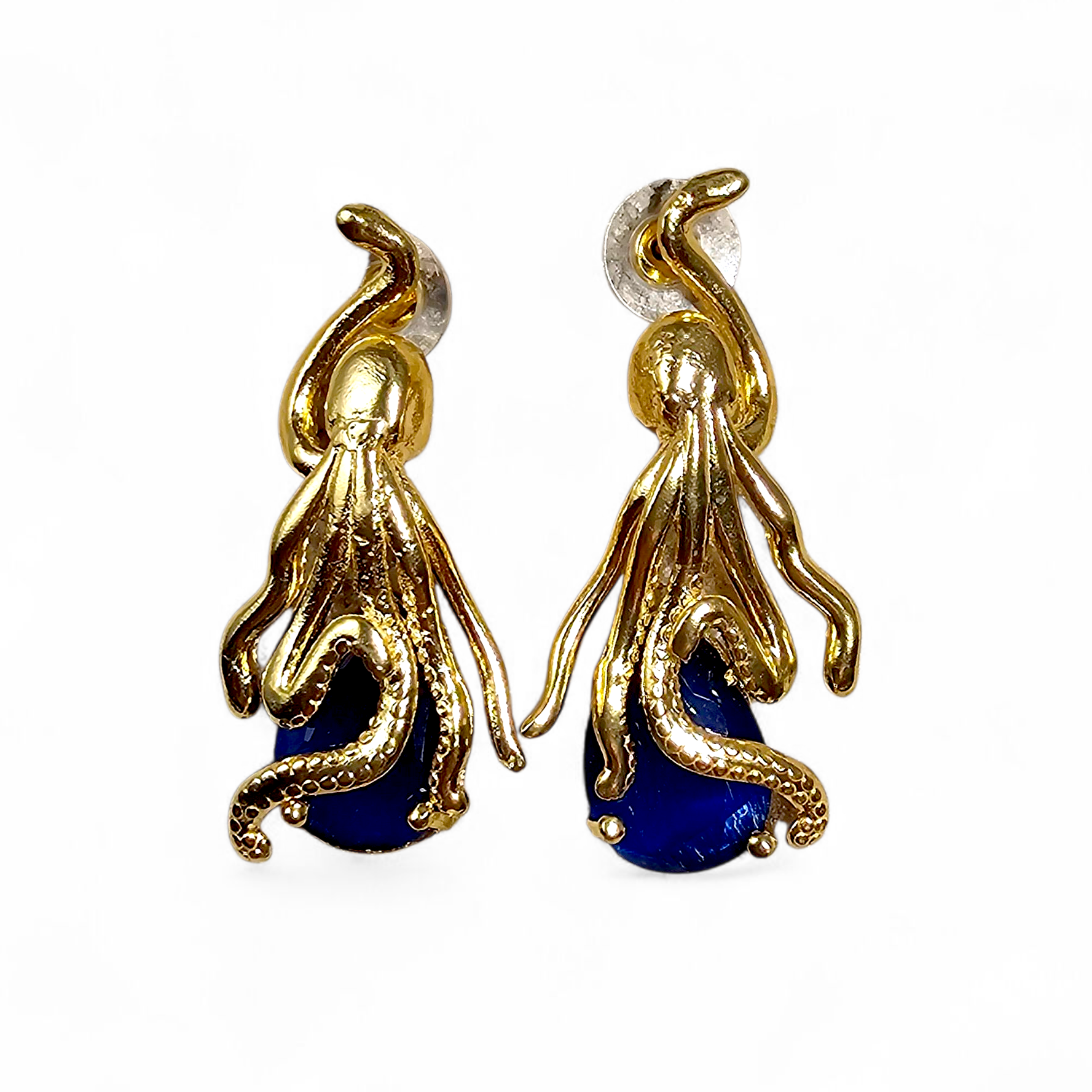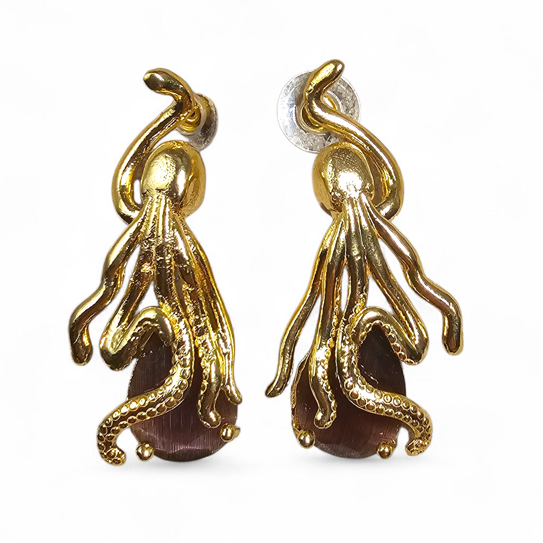 Bold octopus-inspired stud earrings with deep-toned cat eye stones, crafted from 24k gold-plated brass. At 4.5 cm and 8.7 grams, they offer a stronger, more sculptural presence the masculine counterpart to our Octo Petite.