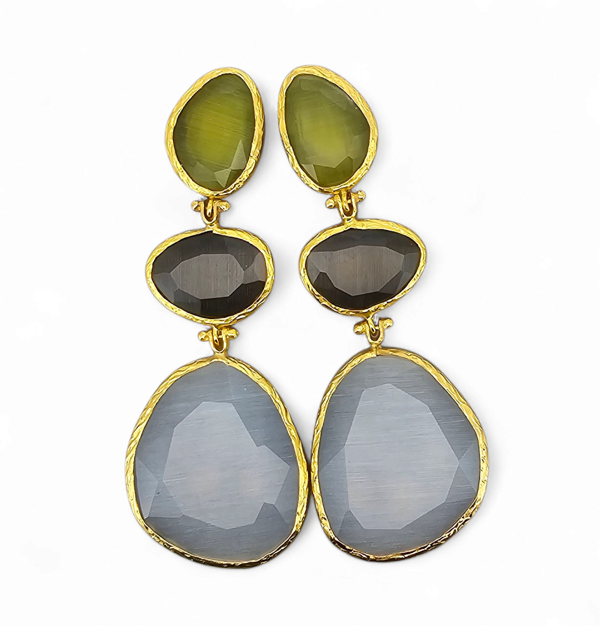 Three cateye stones in grey, brown, and olive earthy, grounded, and quietly radiant.