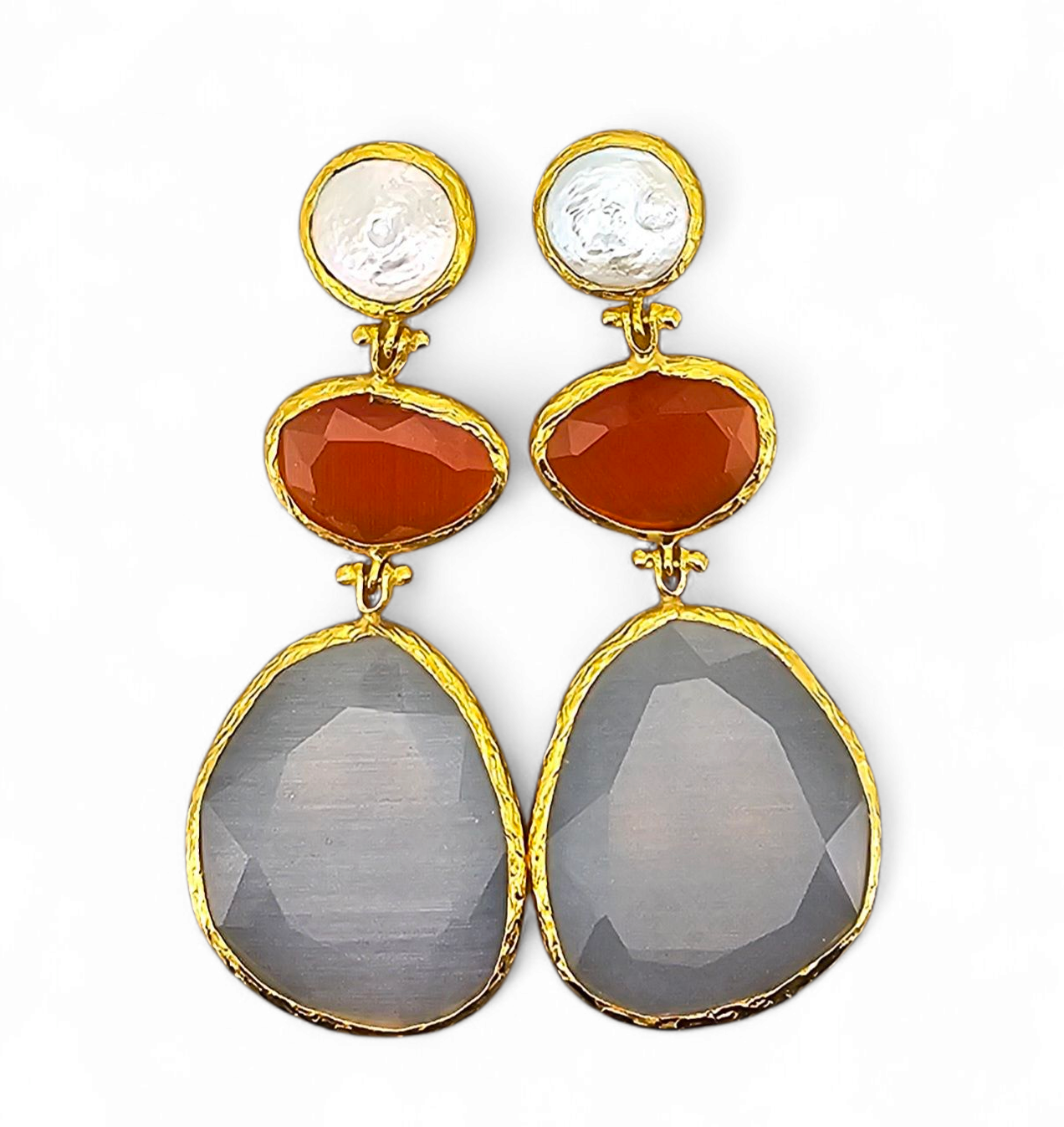 A gentle trio of cateye stones in pearl, orange, and grey subtle light meets soft fire and quiet depth.