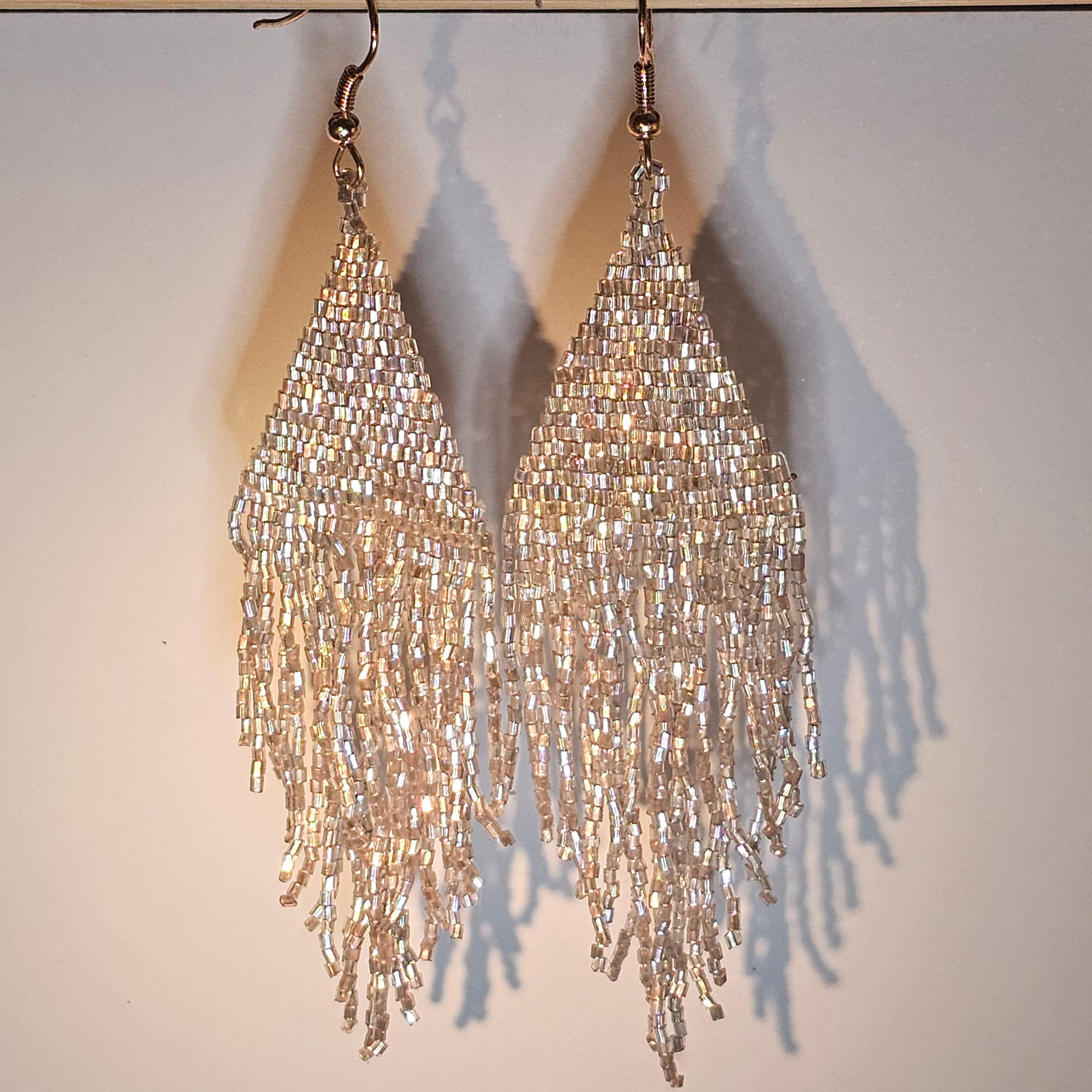 Handwoven earrings made from fine glass beads in silver tones. At 10 cm in length and only 2.8 grams, they’re lightweight and full of movement crafted with rhythm and shine.