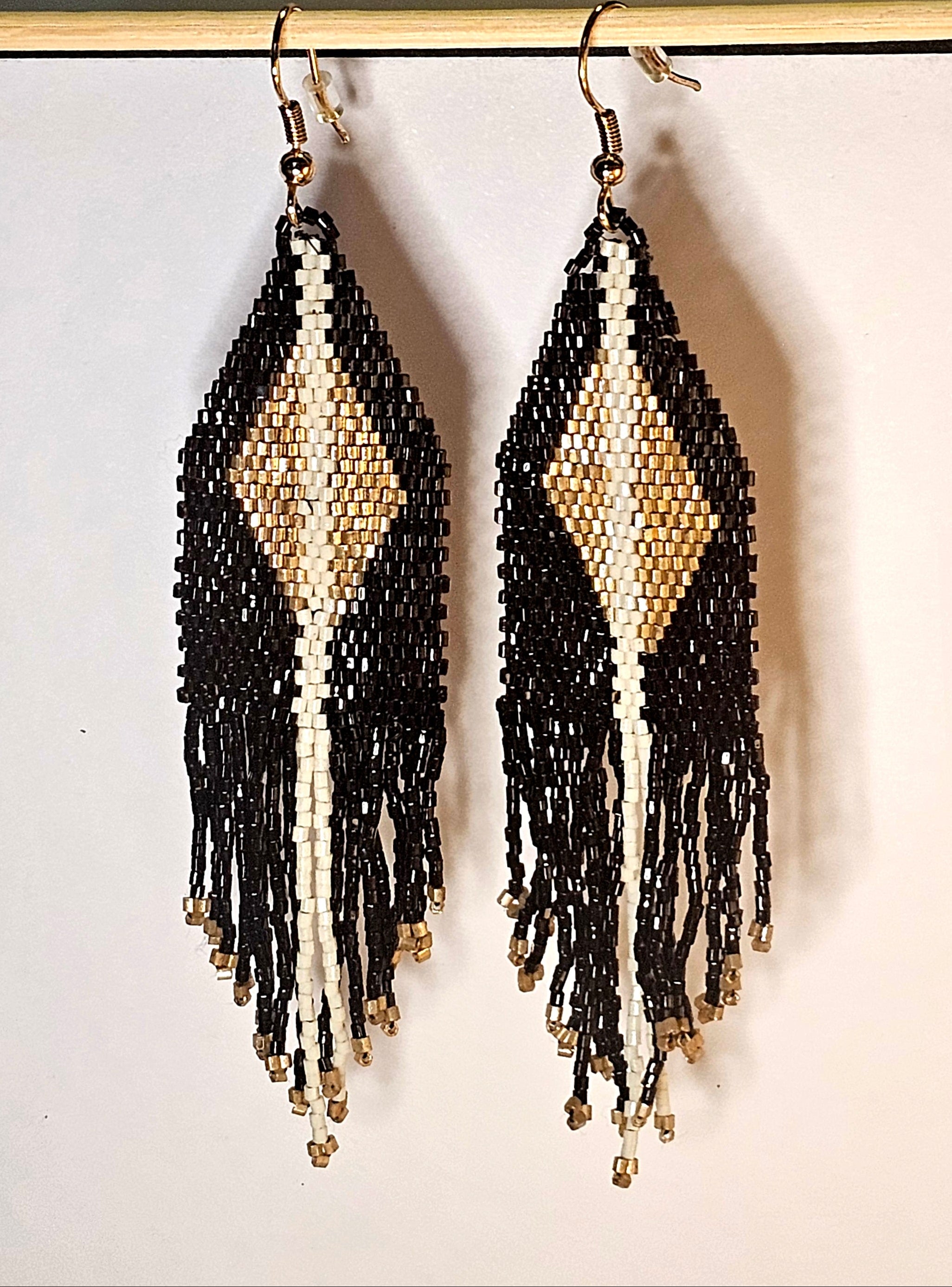 Handwoven earrings made from fine glass beads in black, white, and gold. At 10 cm in length and only 3.1 grams, they’re featherlight bold contrasts, fluid movement.