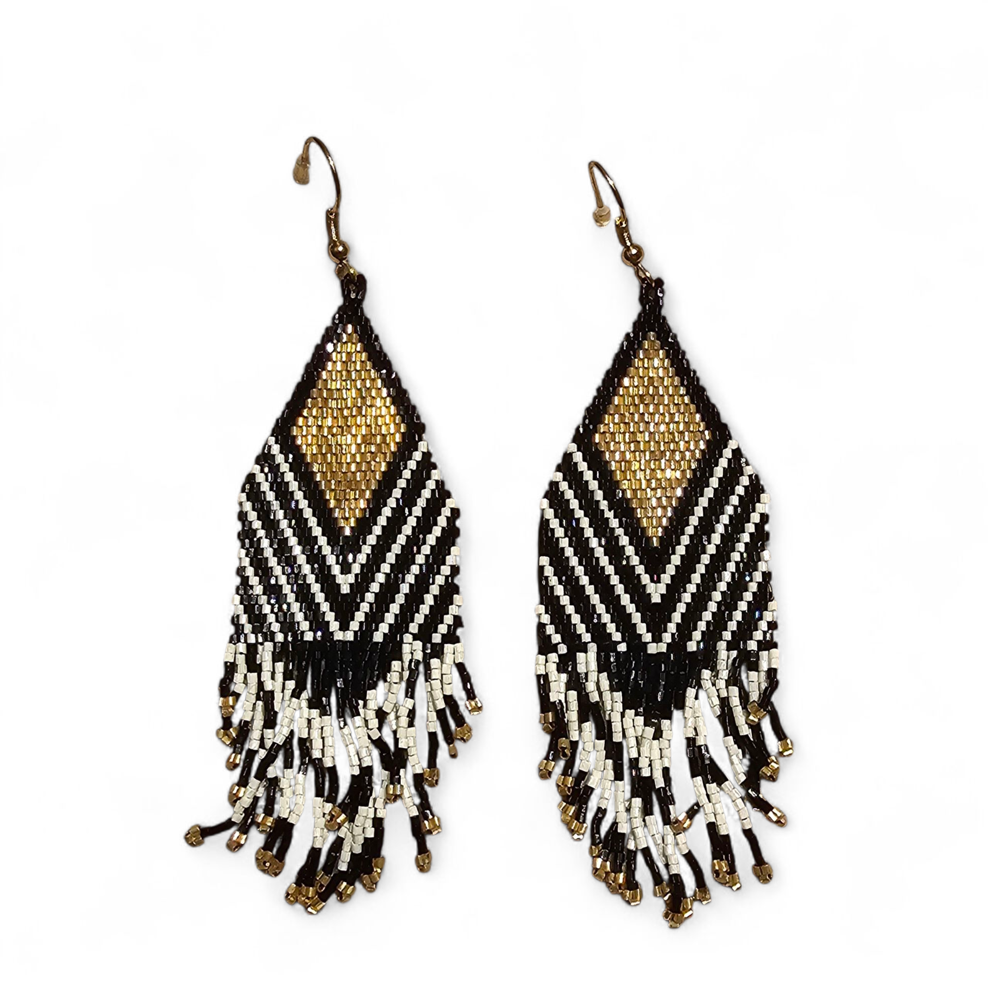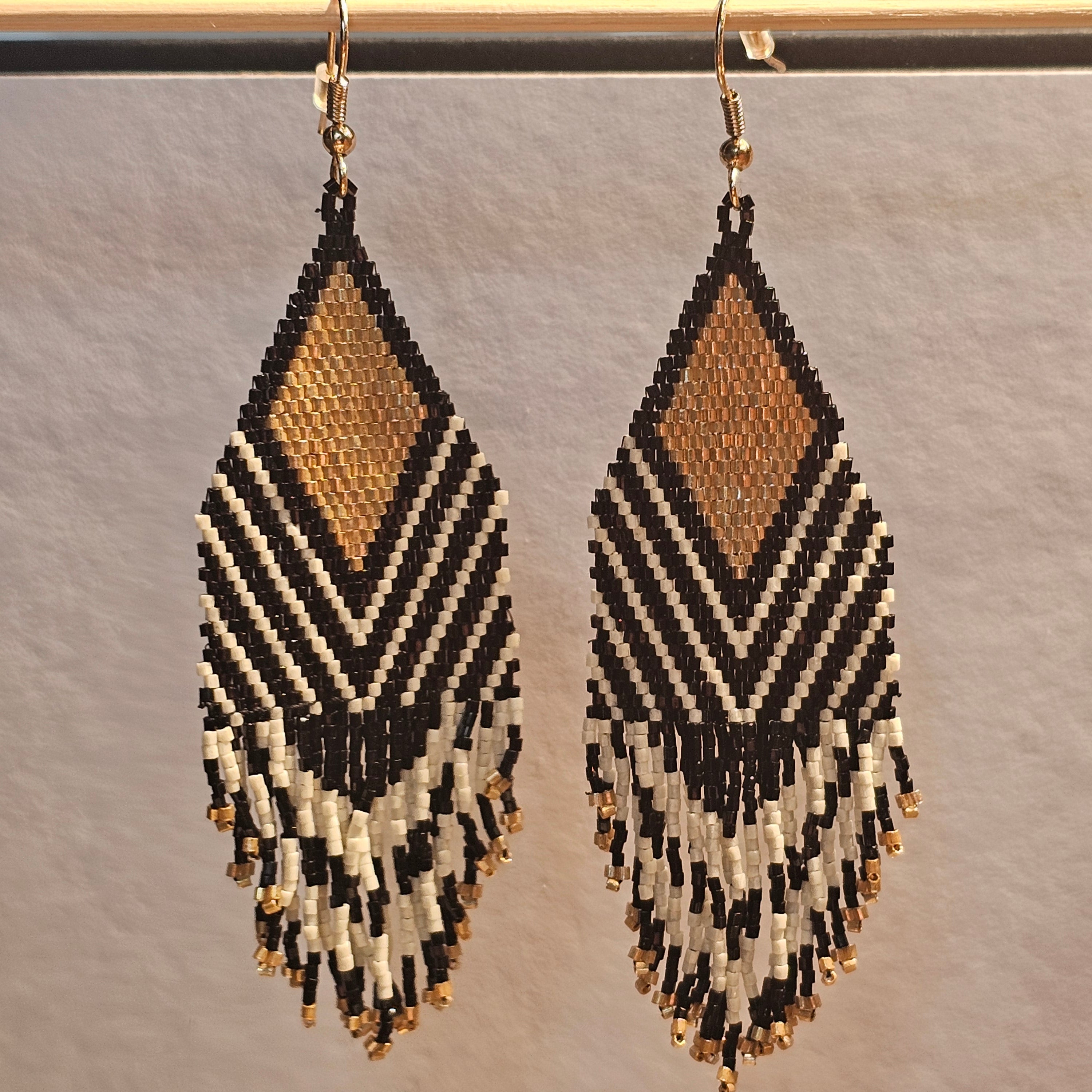 Handwoven earrings made from fine glass beads in black, white, and gold stripes. Measuring 10 cm and weighing only 3.4 grams, they’re beautifully lightweight graphic rhythm, golden shimmer.