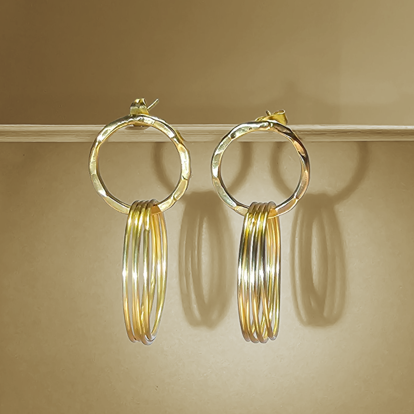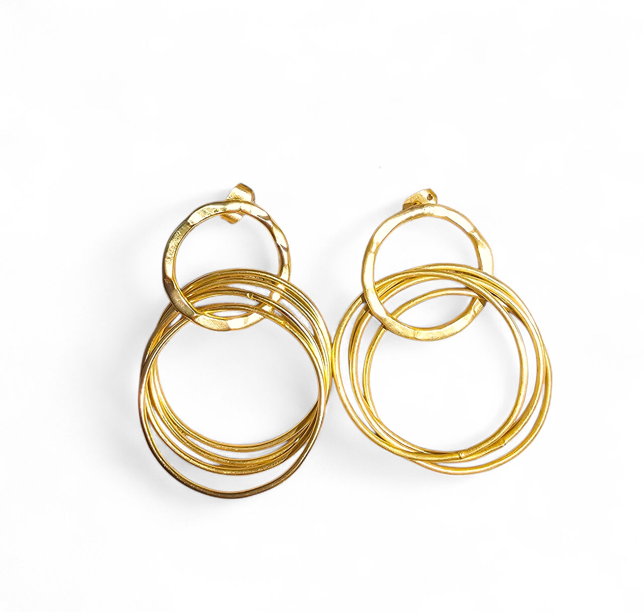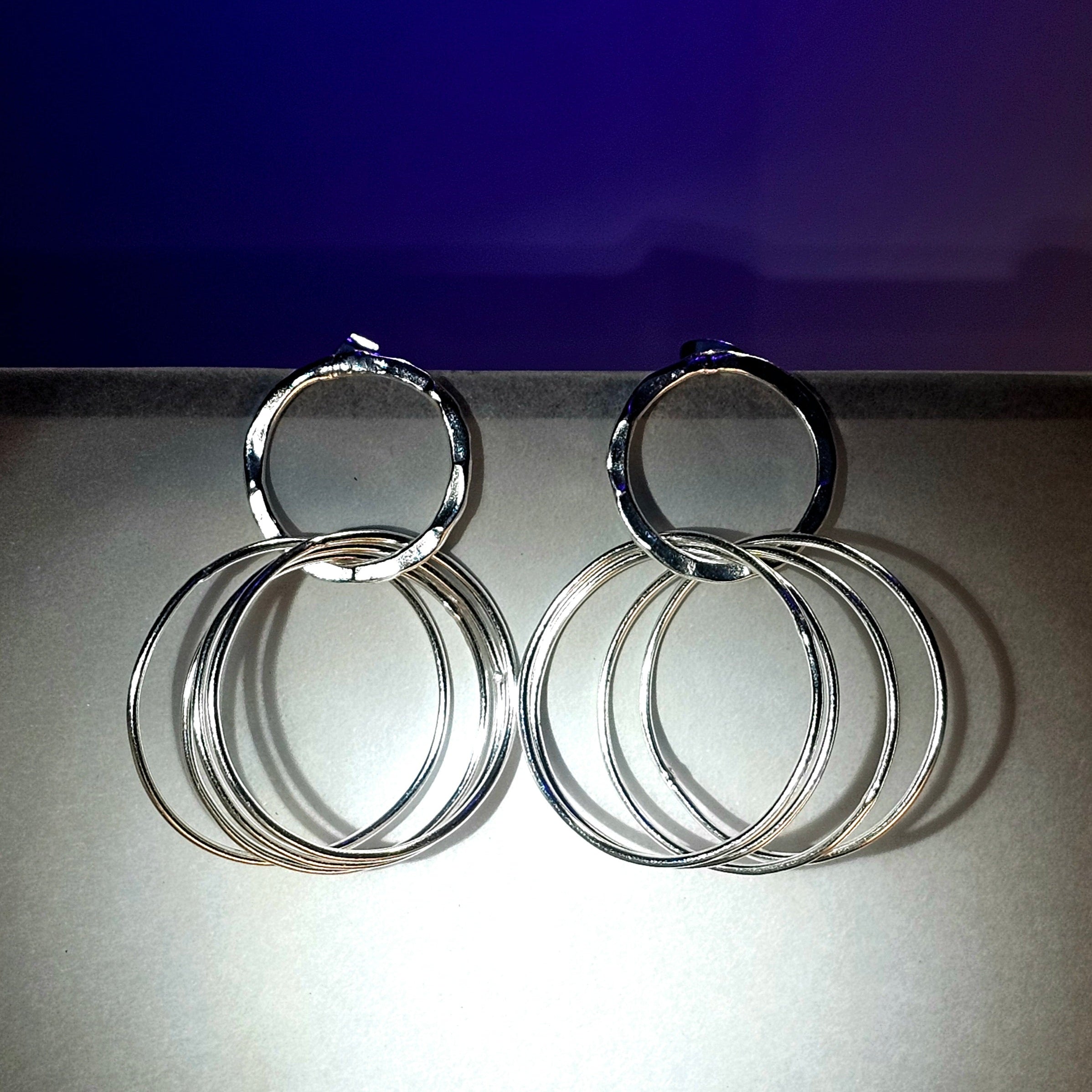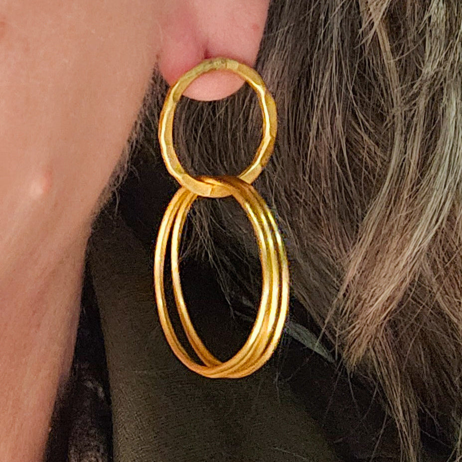 Sculptural hoop earrings with interlinked rings, crafted from silver- or gold-plated brass. Measuring 5 cm and weighing only 5.5 grams, they’re striking yet light strength and flow in perfect balance.