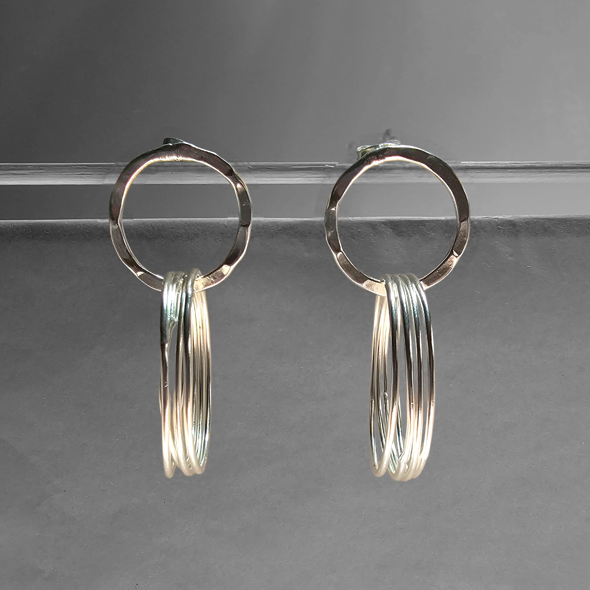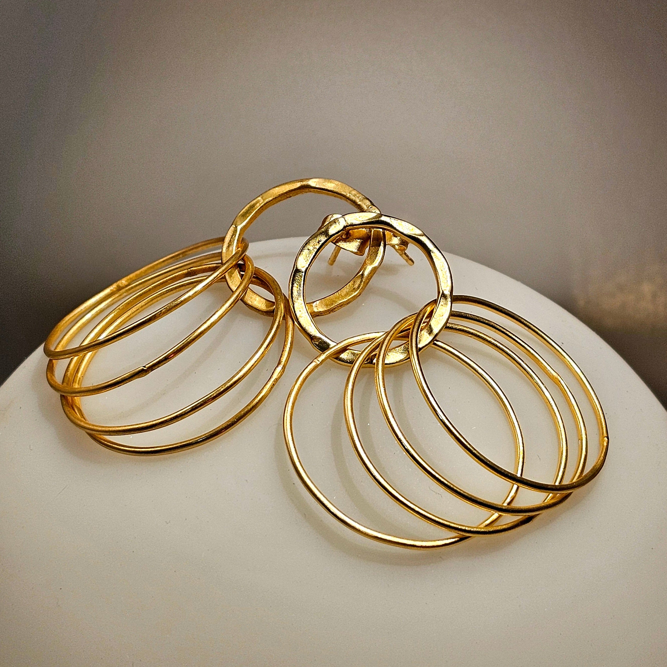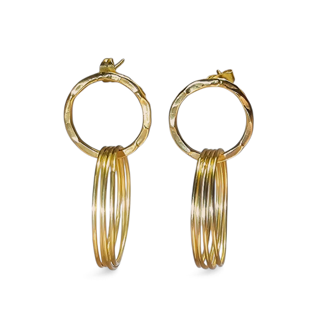 Sculptural hoop earrings with interlinked rings, crafted from silver- or gold-plated brass. Measuring 5 cm and weighing only 5.5 grams, they’re striking yet light strength and flow in perfect balance.