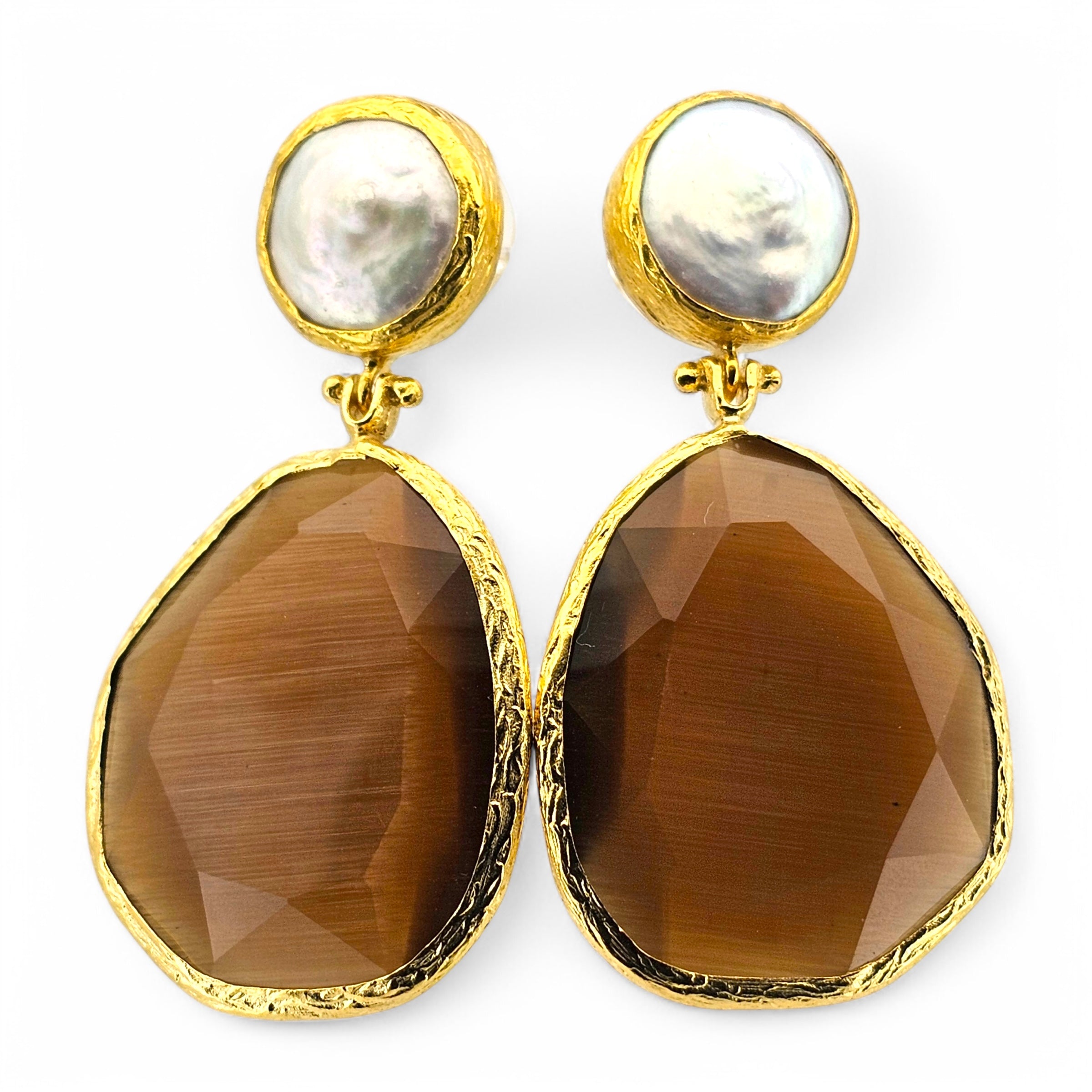 Material: "Made with cateye stones, a freshwater pearl, and 24k gold-plated brass. "