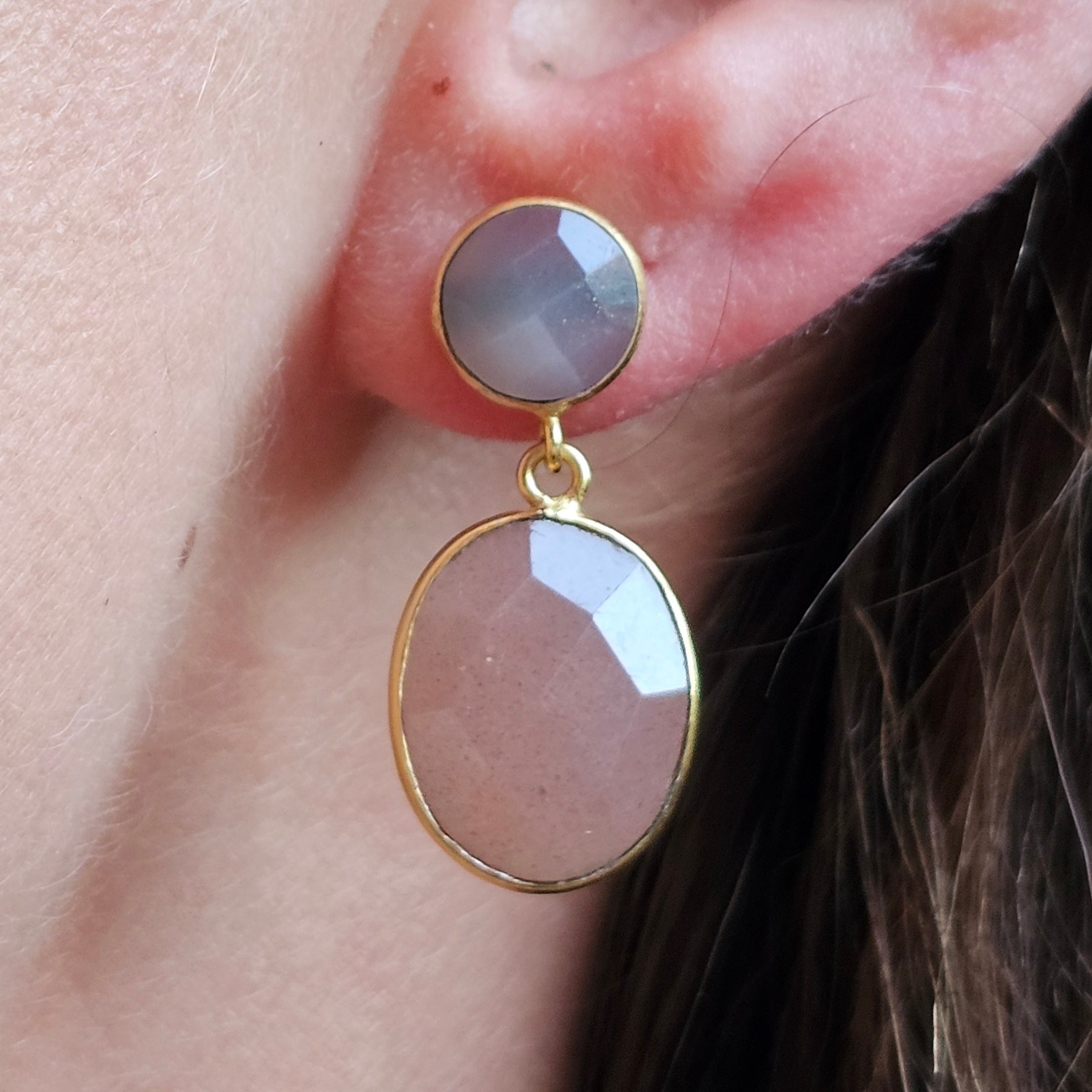 Two-stone earrings in peach moonstone and grey quartz.