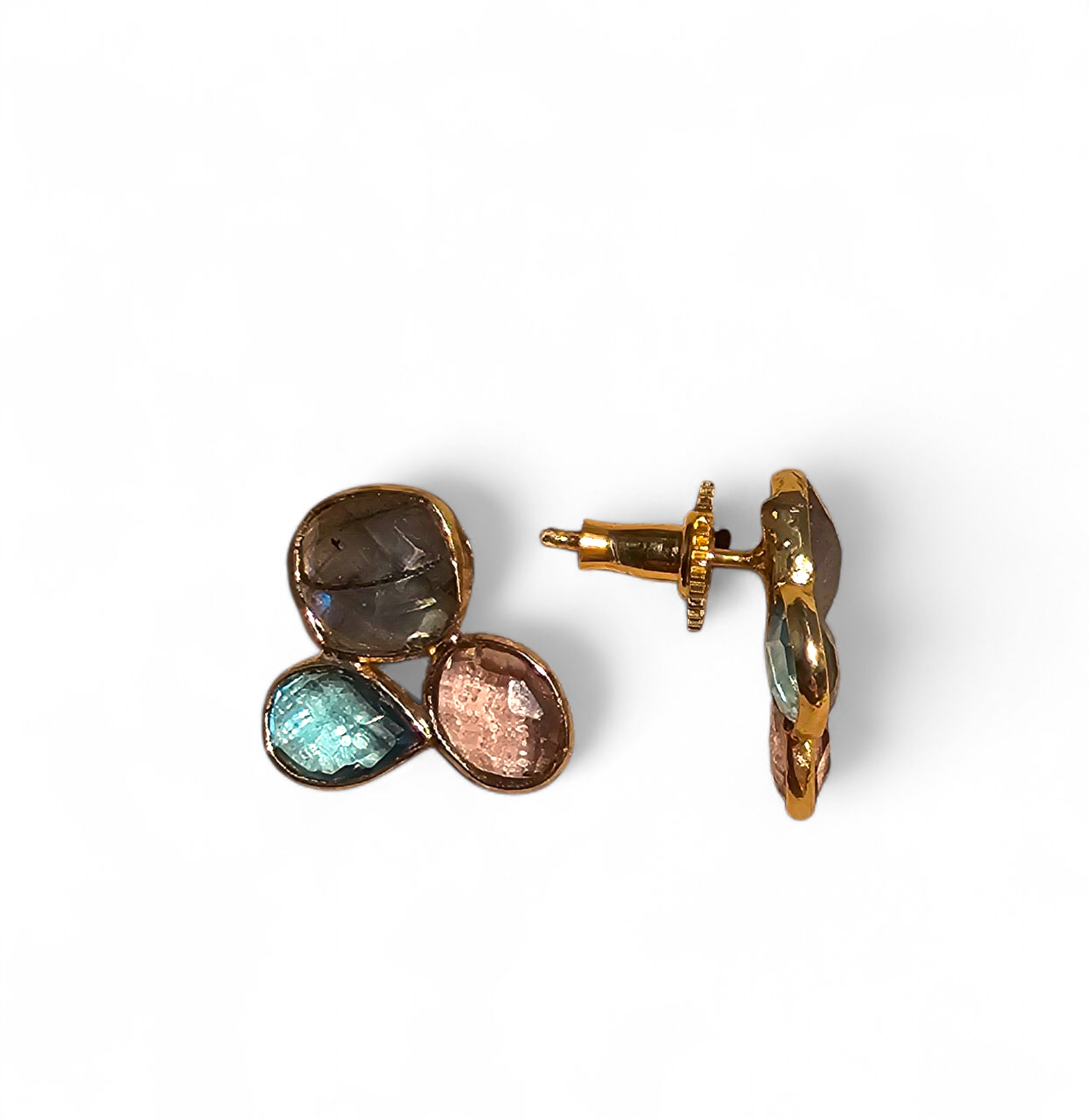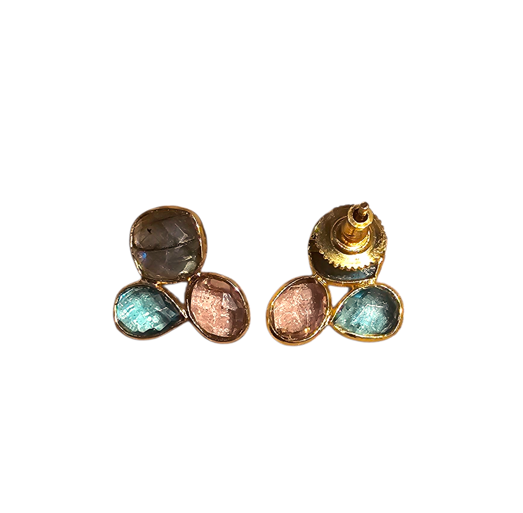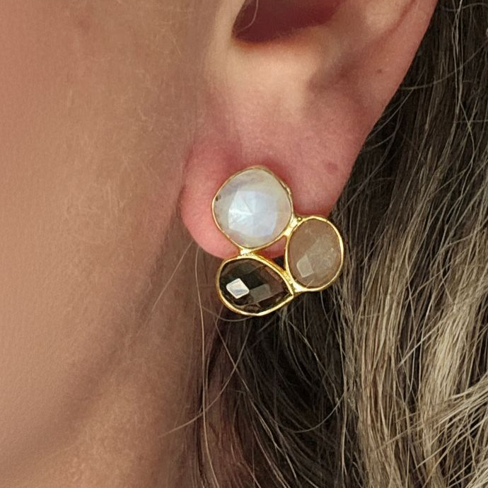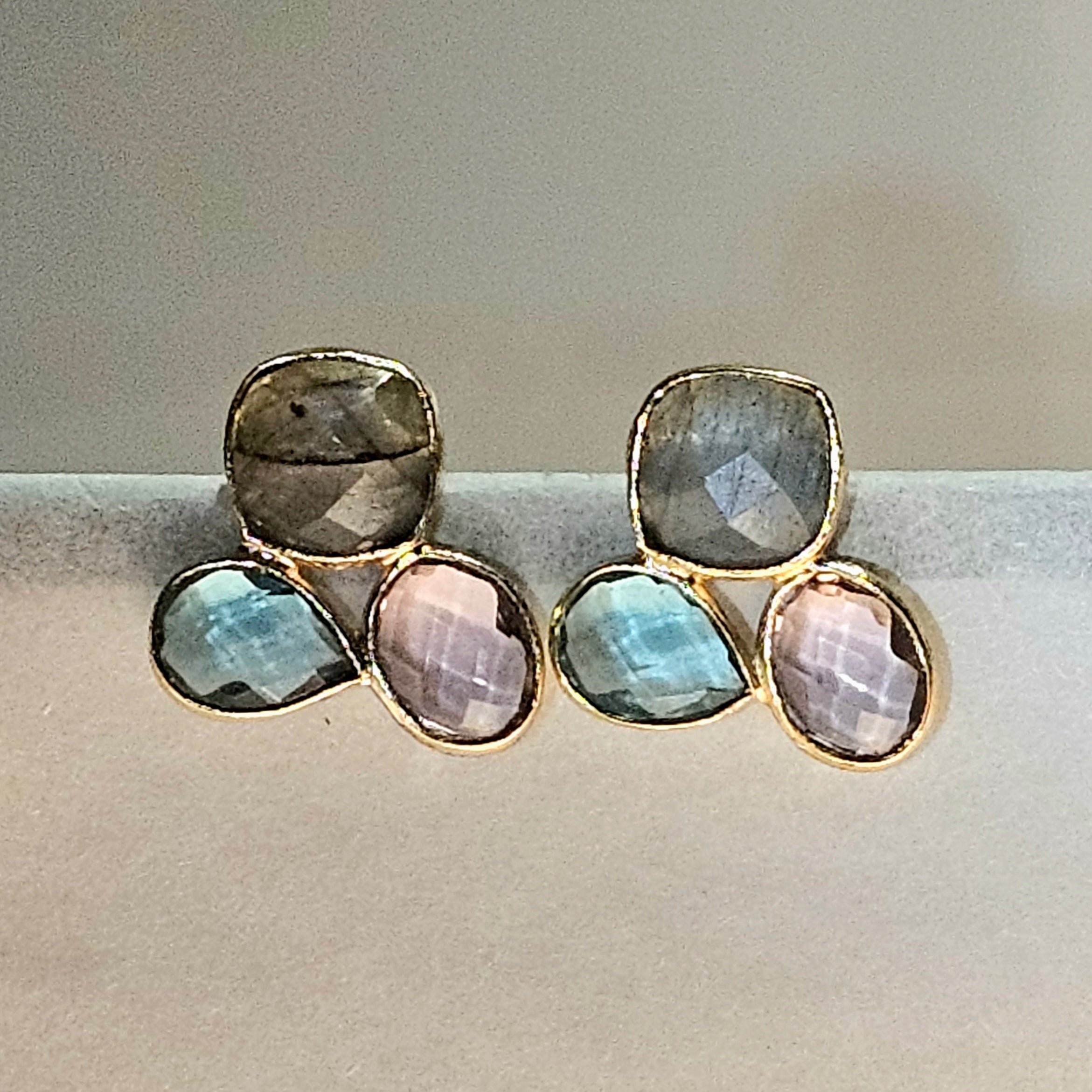 Delicate handcrafted ear studs with three cool-toned stones in labradorite and hydro quartz. Measuring 2 cm and weighing only 2 grams, they’re featherlight soft light, modern balance.