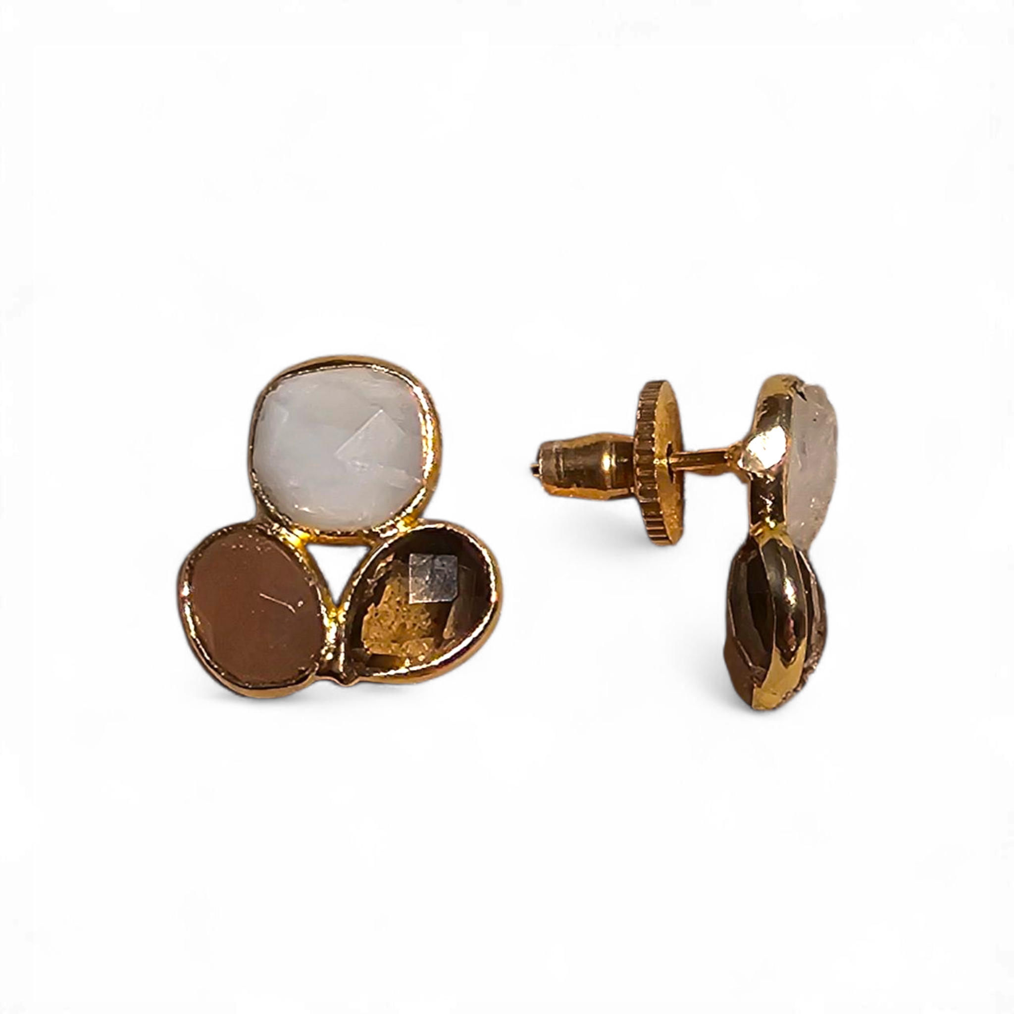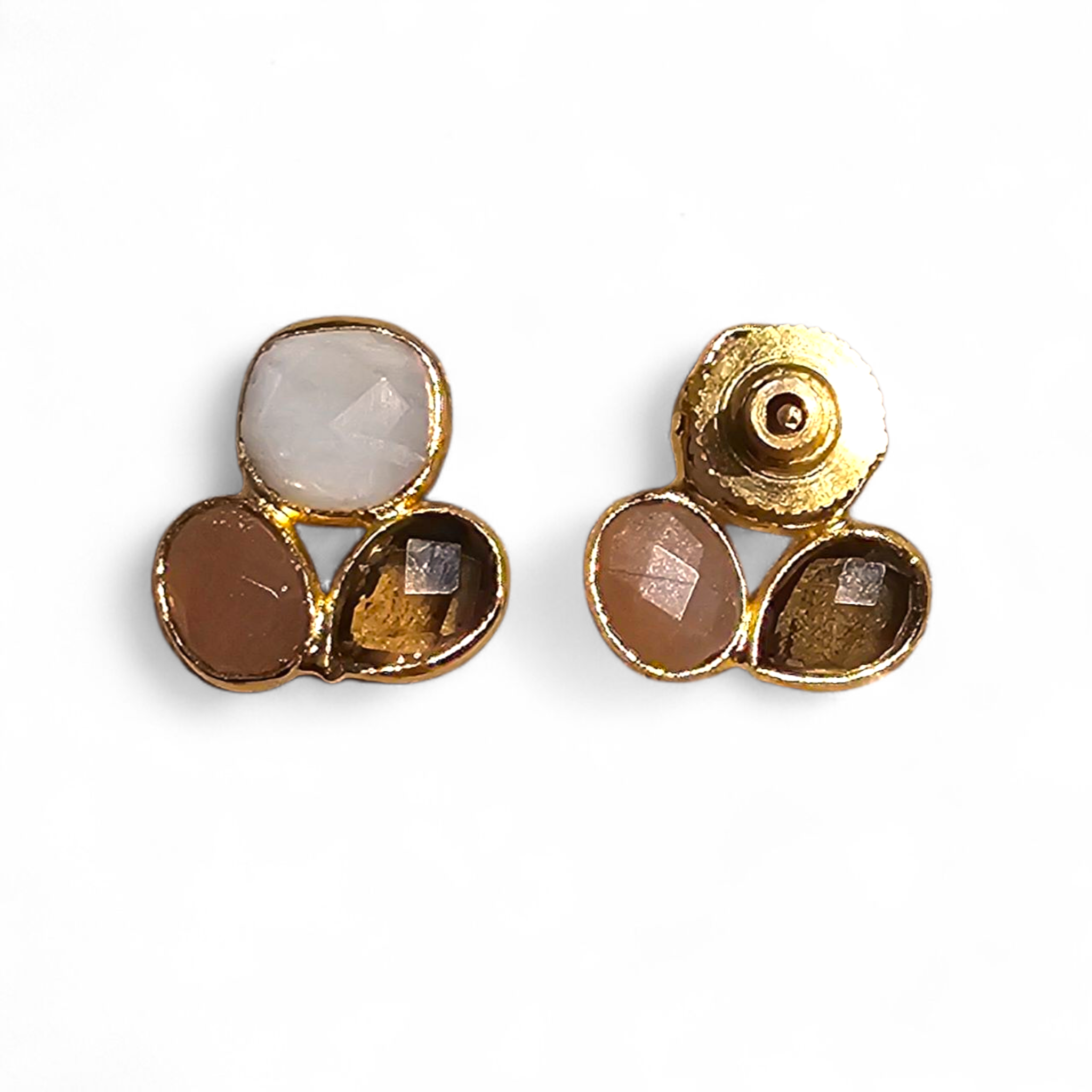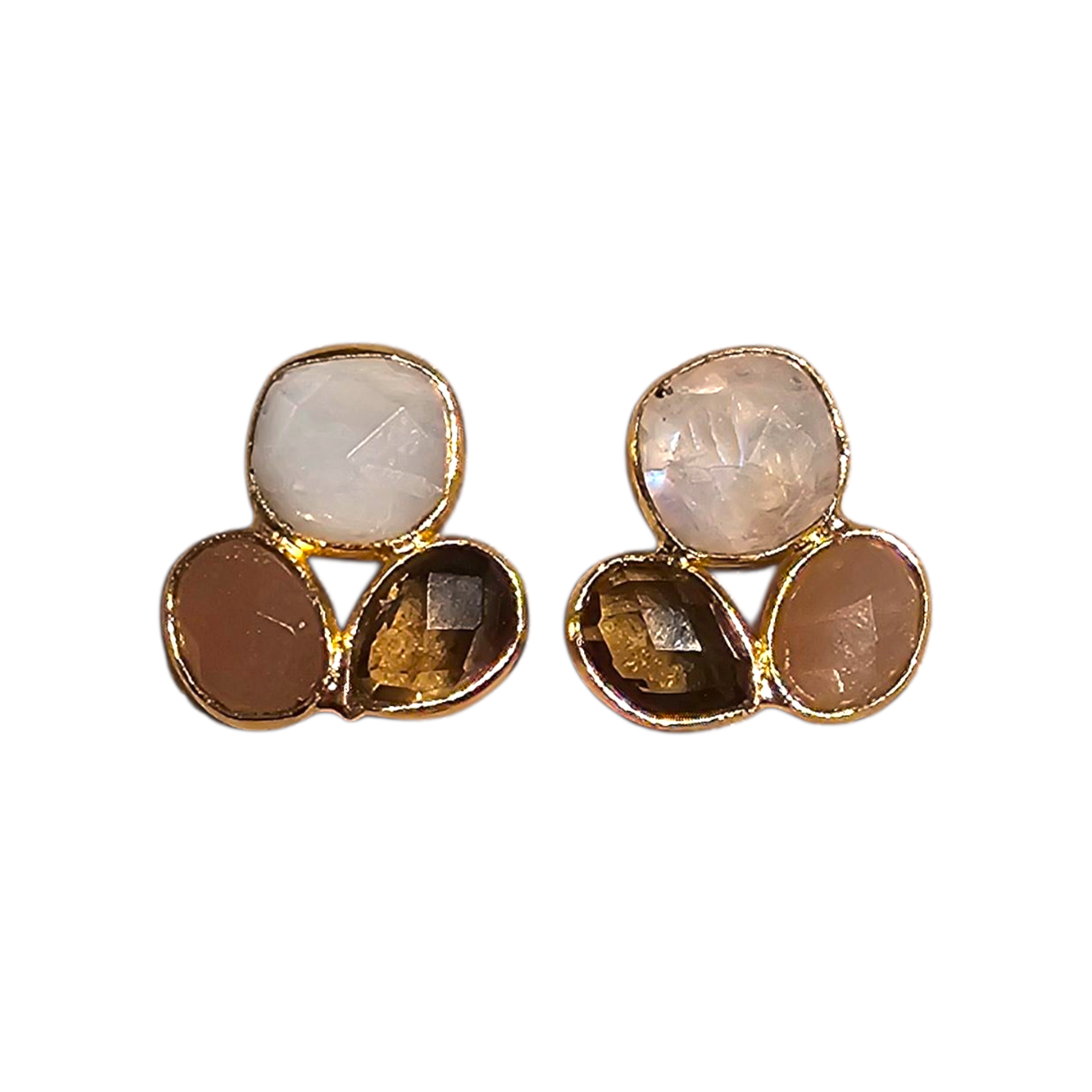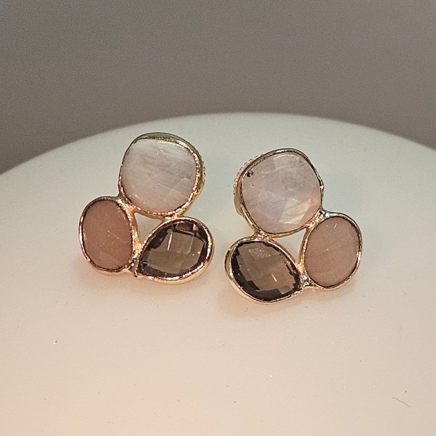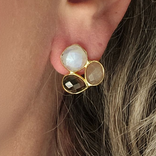 Delicate handcrafted ear studs with three soft-toned stones in moonstone, rose quartz, and peach moonstone. Measuring 2 cm and weighing only 2 grams, they’re featherlight subtle color, radiant light.