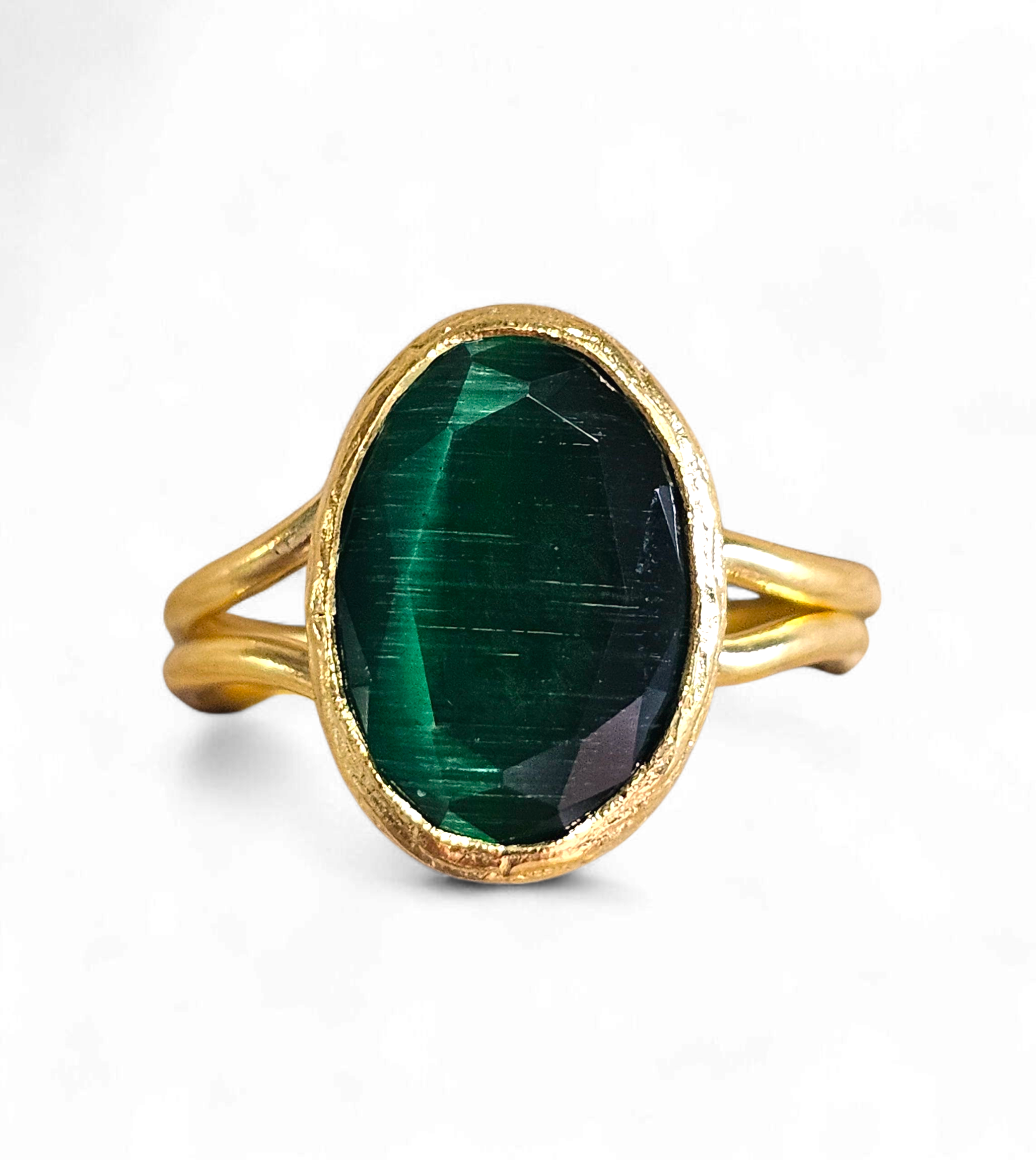 Adjustable ring (16–18 mm) with an emerald cateye stone.