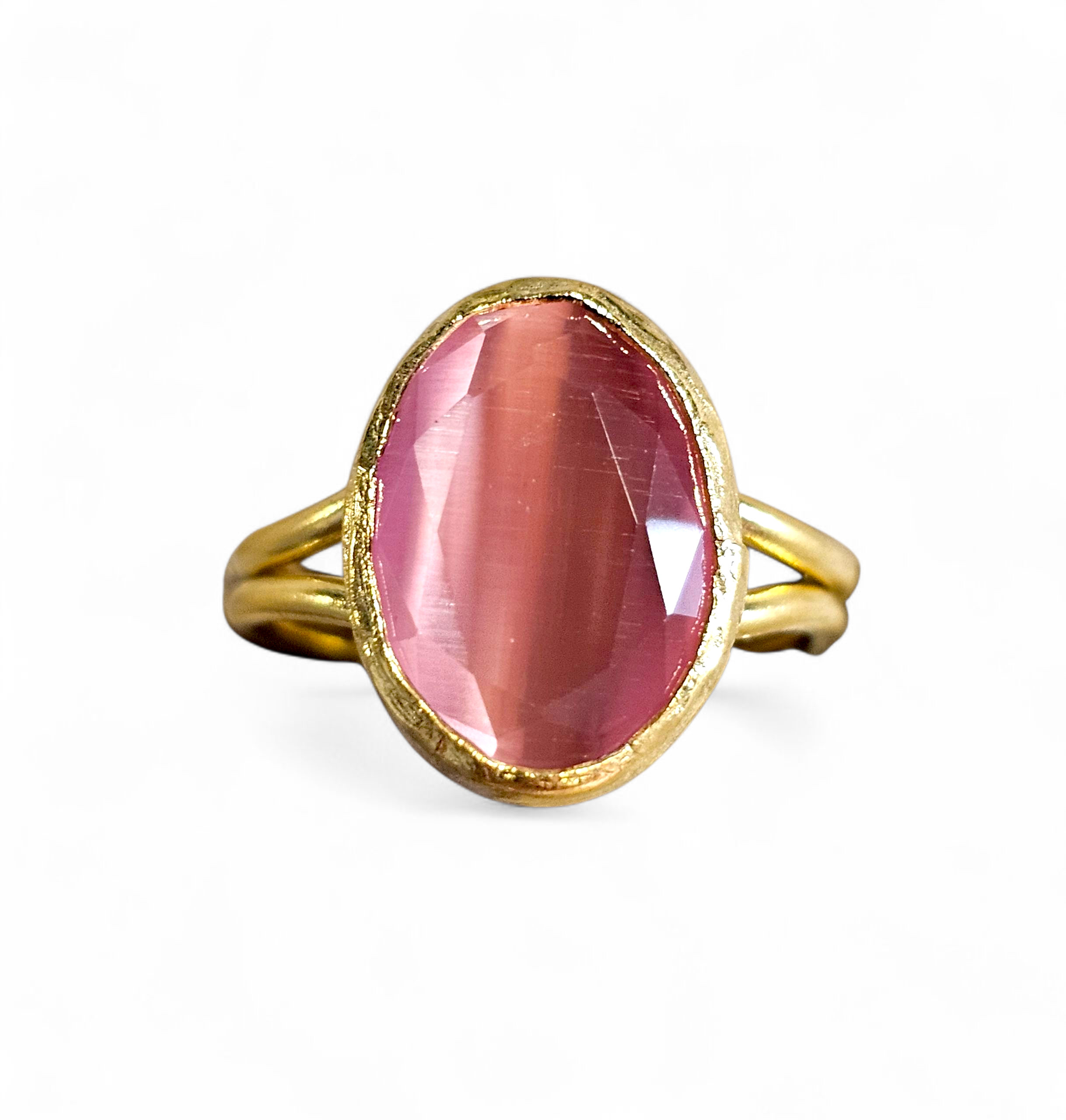 Adjustable ring (16–18 mm) with a pink cateye stone.